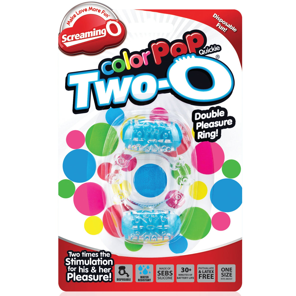 The Two-O Double Pleasure Ring features two super-powered super bright mini motors attached to a stretchy and comfortable pleasure ring for better more satisfying sex. The top motor stimulates her clitoris while the bottom motor buzzes strong for mutual pleasure giving couples something to scream about together! Now available as a convenient ColorPoP Quickie couples can enjoy vibrant vibration at home or on the go with a disposable design they can take anywhere.