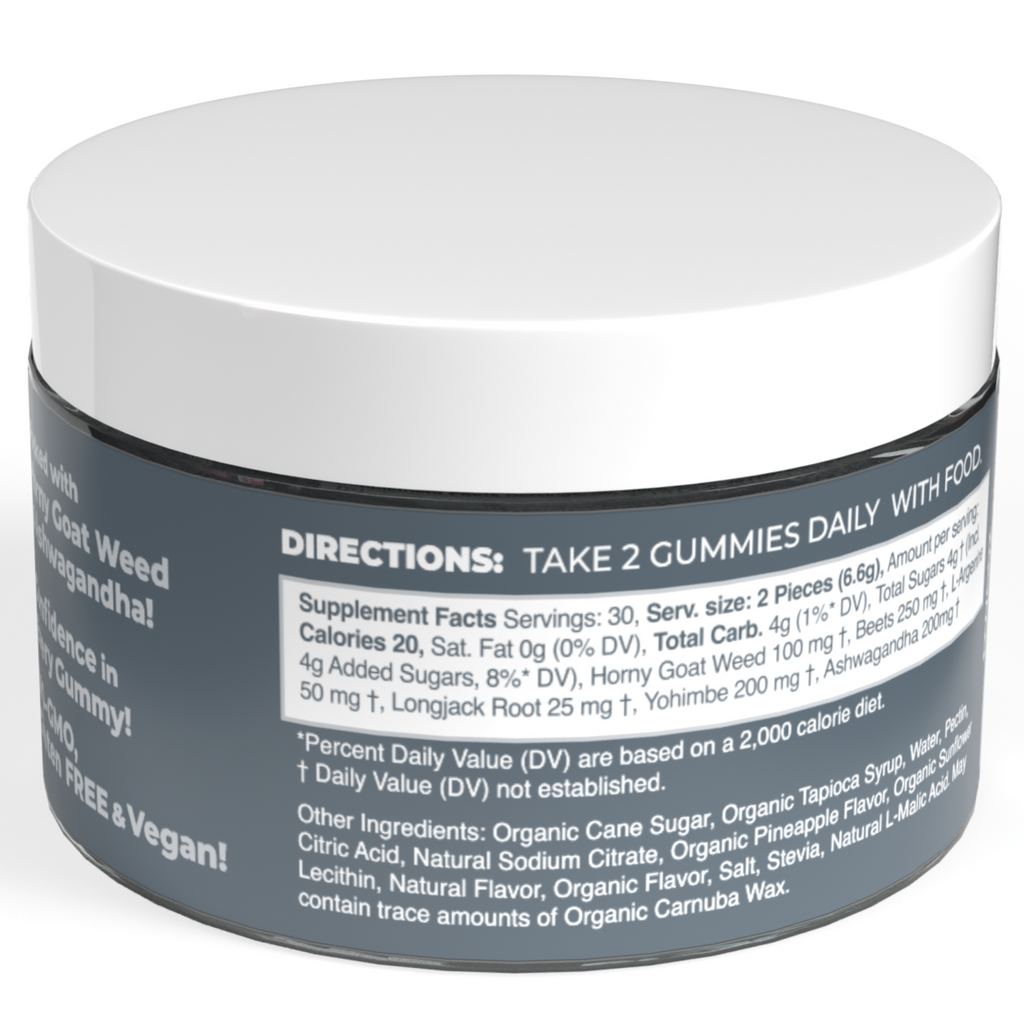 | Amount per serving: | Calories 20, Sat. Fat 0g (0% DV), Total Carb. 4g (1%* DV), Total Sugars 4g †(Incl. 4g Added Sugars, 8%* DV), Horny Goat Weed 100 mg †, Beets 250 mg †, L-Argenine 50 mg †, Longjack Root 25 mg †, Yohimbe 200 mg †, Ashwagandha 200mg †|