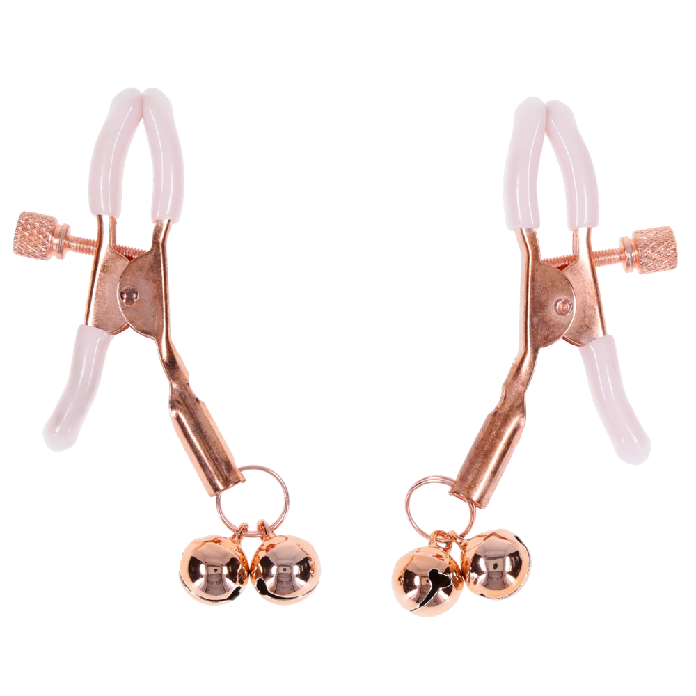 Ding, ding, ding! You’ve made the right choice with the Peaches ‘N CreaMe Bell Nipple Clamps. Adjustable to cling as firmly as you like, just dial up the pressure to match your mood. Wrapped in soft body-safe rubber for comfort and grip, these clamps stimulate blood flow for heightened sensitivity. Adorned with rose gold bells that jingle with every movement, signaling that playtime is in full swing. Let the bells chime as you tease your way to bliss.