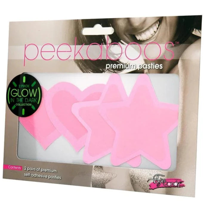 Get cheeky and flirty with Peekaboos Pasties! This 2-pair set features self-adhesive pasties in hot pink with glow in the dark hearts and stars. Perfect for a playful night out, these pasties will make sure you stand out and keep the fun going all night long!