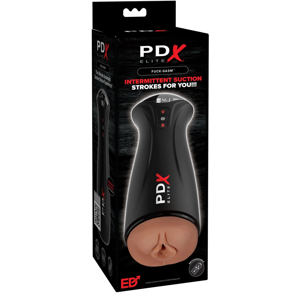 The PDX ELITE Fuck-Gasm elevates masturbation with powerful intermittent suction and vibration for the ultimate stroker experience. It's a perfect storm of sensation for heightened solo sex sessions that can be customized to your personal moods! Get ready for explosive hands-free pleasure as the Intermittent Suction Technology automatically sucks your penis in and out. Designed for ultimate pleasure, the textured walls of the ultra-soft sleeve is like nothing you've ever felt before! The Fuck-Gasm is ready when you are, and will deliver the most intense orgasms you've ever had!