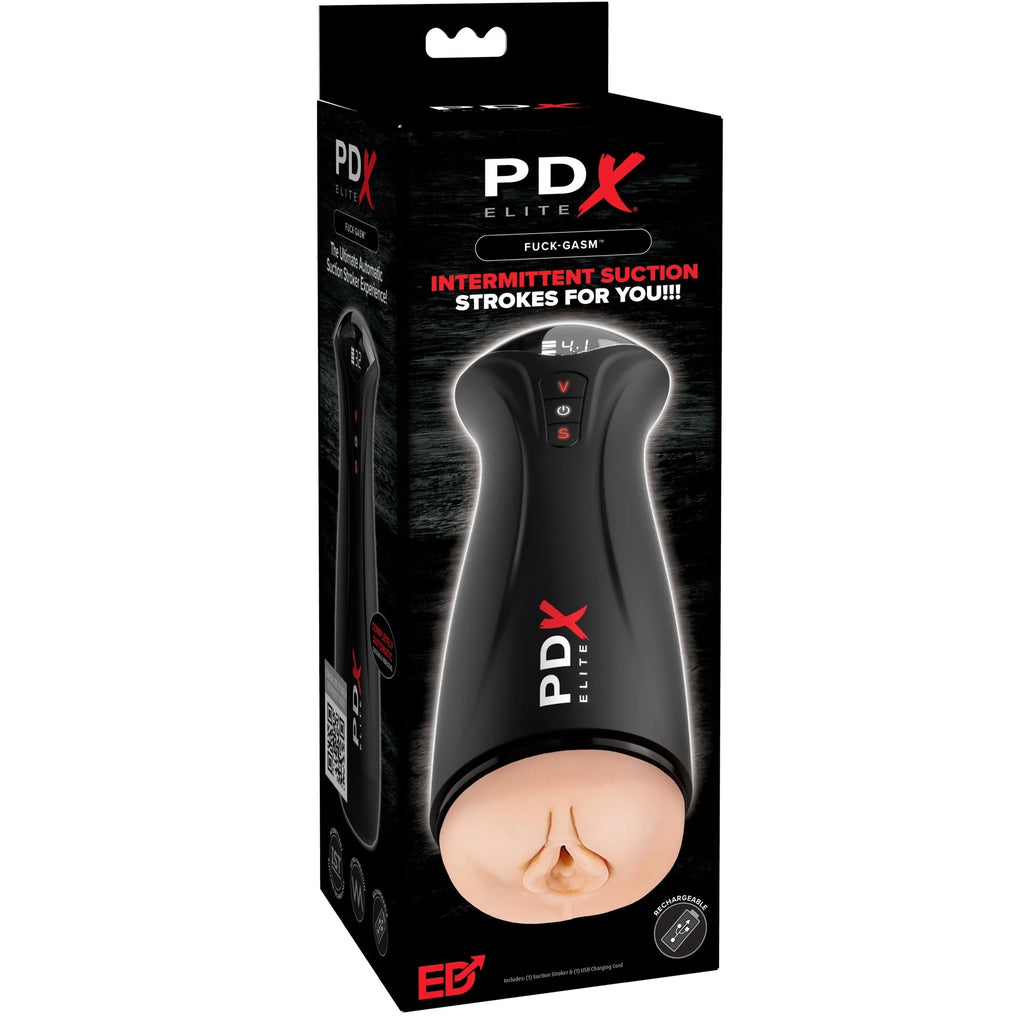 The PDX ELITE Fuck-Gasm elevates masturbation with powerful intermittent suction and vibration for the ultimate stroker experience. It's a perfect storm of sensation for heightened solo sex sessions that can be customized to your personal moods! Get ready for explosive hands-free pleasure as the Intermittent Suction Technology automatically sucks your penis in and out. Designed for ultimate pleasure, the textured walls of the ultra-soft sleeve is like nothing you've ever felt before! The Fuck-Gasm is ready when you are, and will deliver the most intense orgasms you've ever had!