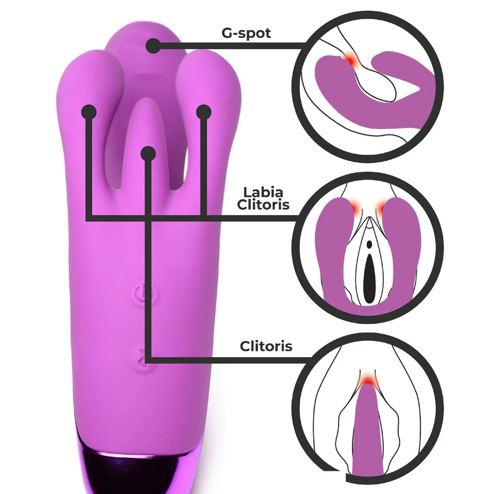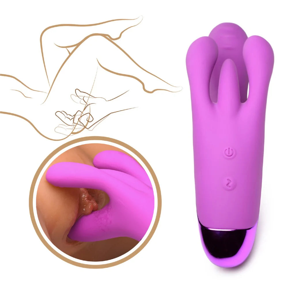 Indulge in pleasure you’ve never known before with this Triple Rabbit Vibrator! The unique design is created specifically for female comfort and pleasure. The G-spot targeting shaft is comfortably curved with a rounded head and textured ridges so it hits your sweet spot with ease. The triple rabbit clit stimulator vibrates against your clitoral glans and your labia so you can get stimulated at every angle! Enjoy 3 speeds and 7 patterns of powerful vibration from three different motors. Take it with you in the shower, pool, jacuzzi or bathtub! This toy has a waterproof rating of IPX7 allowing you to enjoy all kinds of wet fun! Made of premium silicone, it is silky smooth and phthalate-free for body safe, worry free fun! Between uses, recharge the battery with the USB cable provided. Wash after use with warm water and soap, then spray with a toy cleaner and wipe dry.