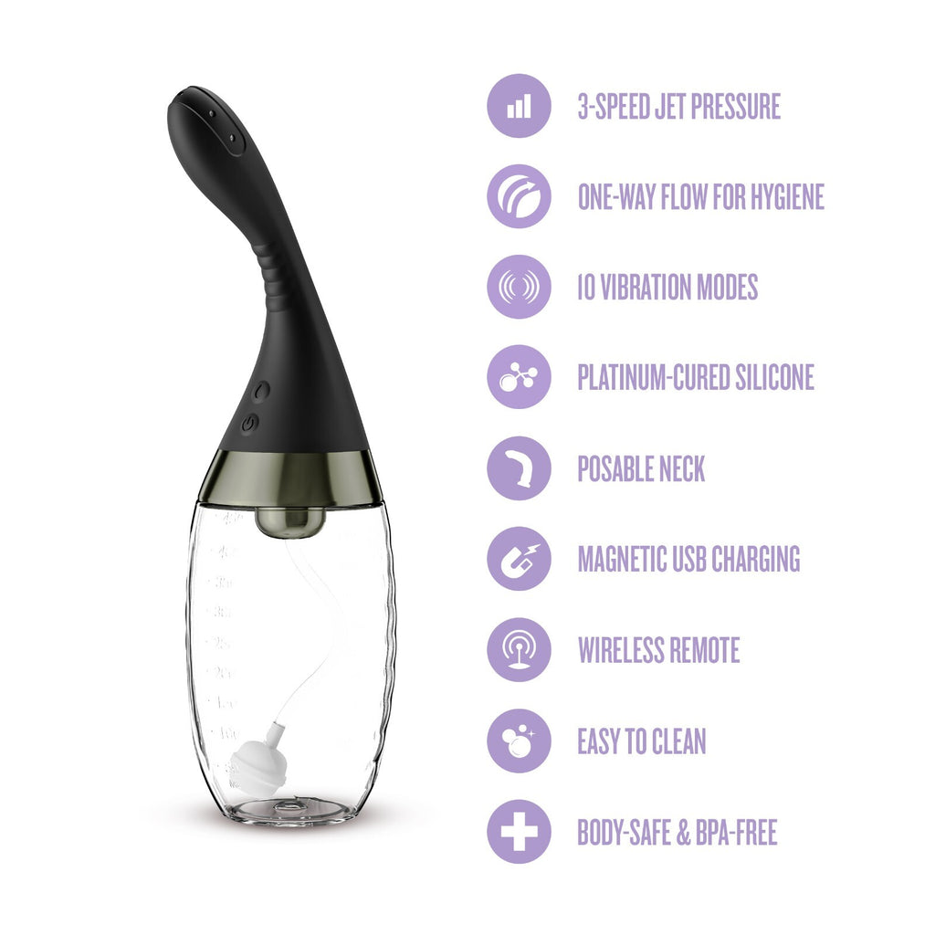 Turn cleansing into a refreshing ritual with Anal Adventures Aqua Jet, a premium anal douche designed to elevate your prep routine. Featuring a customizable 3-speed jet system and 5 precision spouts, Aqua Jet delivers a deep, invigorating rinse that’s tailored to you. Its one-way flow design helps prevent backflow, while 10 powerful vibration modes help relax your body and support a more thorough clean. The posable, ergonomic neck moves with you, bending effortlessly for comfortable reach and easy positioning. Made from body-safe, platinum-cured silicone with a silky-smooth finish, Aqua Jet is gentle on skin and designed for thorough, comfortable cleansing. It’s IPX7 waterproof, USB rechargeable, and easy to disassemble for fast cleaning and care. Perfect for beginners or experienced users, Aqua Jet transforms cleansing from routine to ritual, leaving you feeling fresh, relaxed, and ready for exploration.
