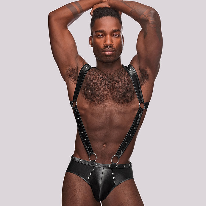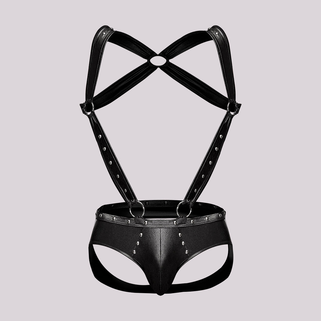 Introducing the Uranus, the ultimate addition to your men's underwear collection. Made with faux leather, this jock brief is designed to showcase your derriere while also providing a comfortable fit. The suspender straps and harness-style back add a touch of edginess to your look, perfect for those who love to indulge in a little bit of fetish play. Whether you're looking to spice up your bedroom antics or simply want to feel confident and sexy, the Uranus is the perfect choice. So why wait? Add this must-have piece to your wardrobe today and get ready to unleash your inner desires.