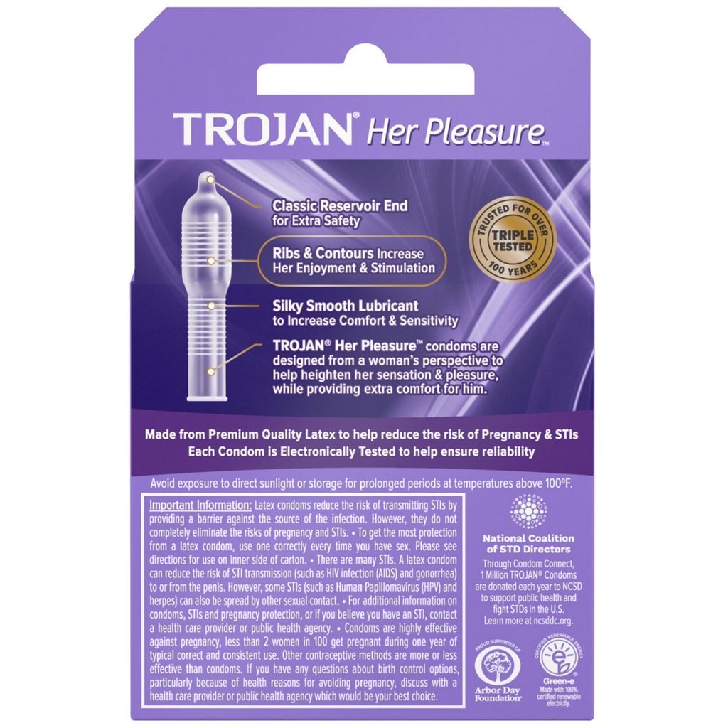 Trojan™ Her Pleasure™ condoms are designed with her body in mind. Women can enjoy the ribbed and contoured design that helps heighten her stimulation, while men can experience a comfortable, natural feel. She’ll be loving it, so he will too.