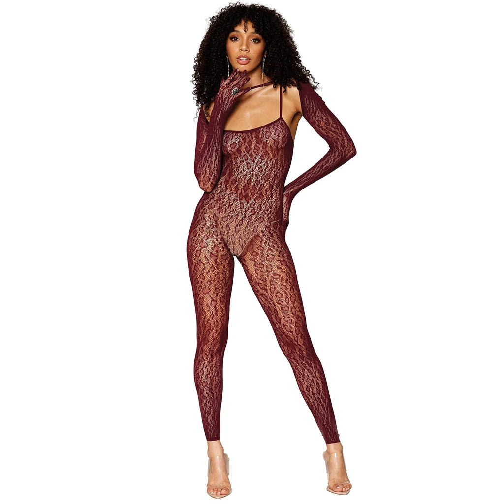Leopard fishnet catsuit bodystocking and shrug. Scoop neckline with shoulder straps and footless bodystocking. Separate long sleeve shrug with built in fingered gloves. (G-String not included)