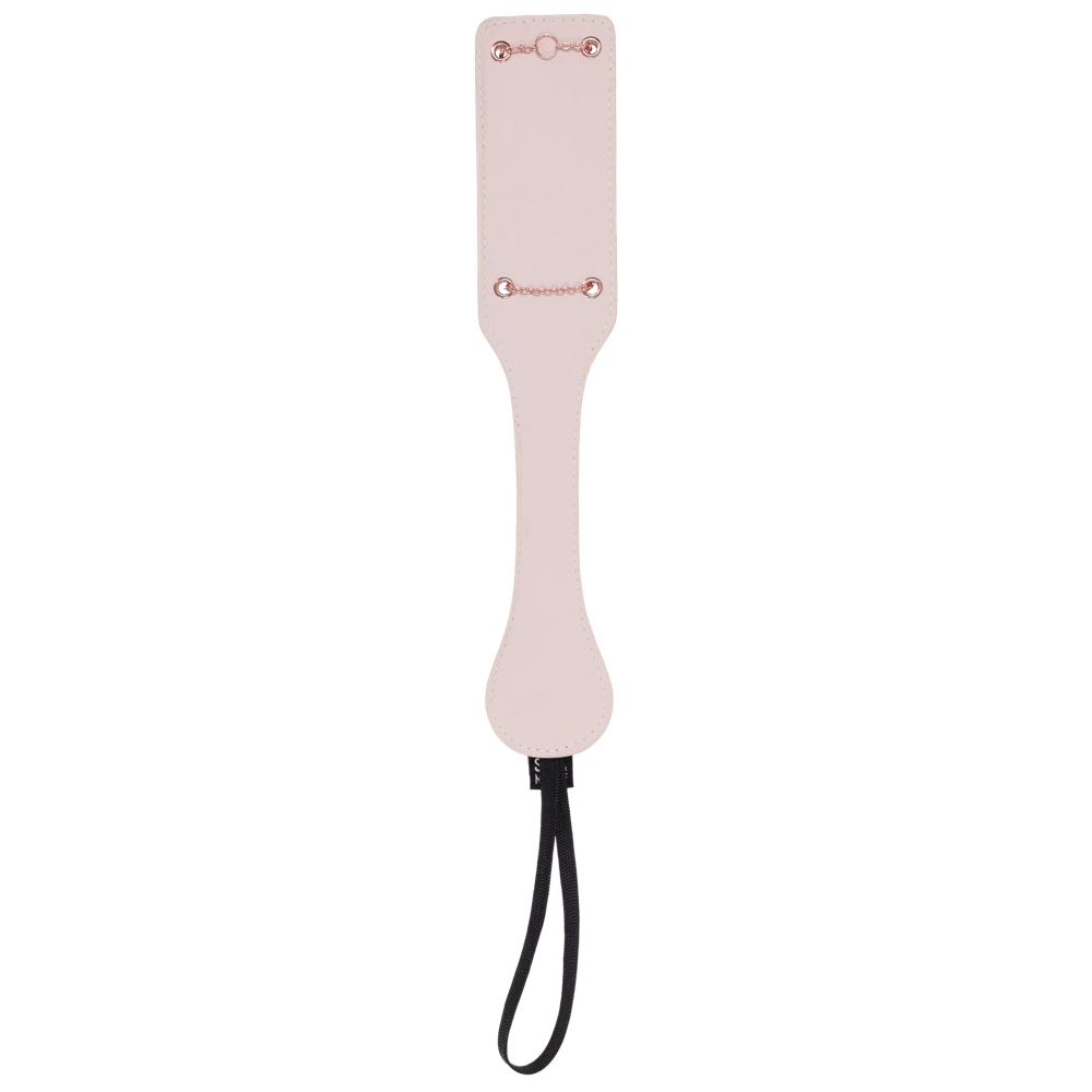 Choose your own pleasure. The Peaches ‘N CreaMeChain Paddle is crafted from soft, smooth faux leather with detailed saddle-stitching and sealed edges for lasting durability. One side featurescrisscrossed rose gold chains for bold texture, marking the skin with intent, because X always marks the spot. The other side offers a smoother chain-lined surface for a gentler touch. From a stinging tease to sharper correction, deliver every strike with purpose. A secure wrist loop ensures a steady grip, easy storage, and even easier surrender.