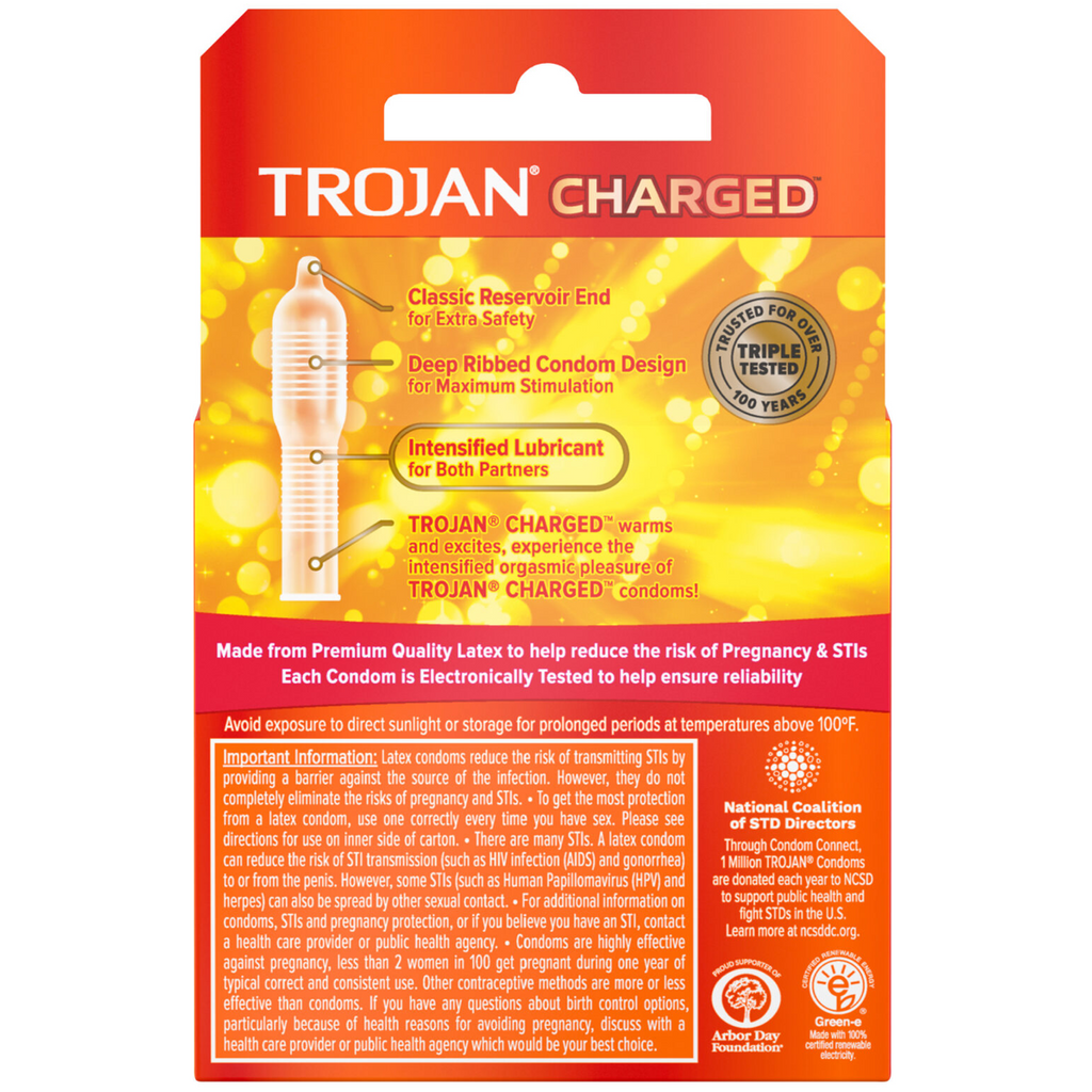Here come the fireworks. Trojan™ Charged™ condoms are specifically designed to supercharge orgasmic pleasure. Not only do they have intensified lube for both partners, they also feature some really, really deep ridges for maximum stimulation. The special lubricant and the deep-ribbed body warm and excite to make the big O even more of an “Oh!”