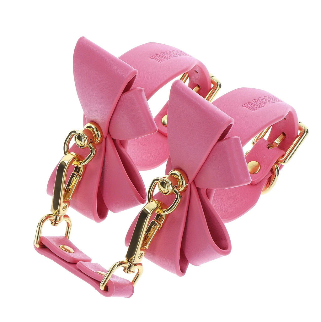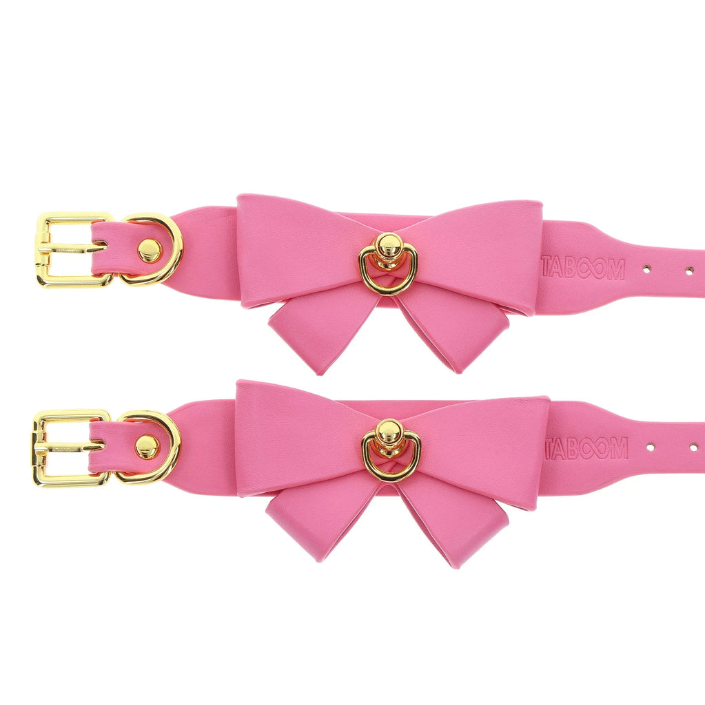 Add a touch of cuteness and sexiness to your bondage collection with these Taboom Malibu Ankle Cuffs. Embrace your playful side with these pink vegan PU leather cuffs adorned with a playful bow and tantalizing gold-plated metal details. Blend style and pleasure, explore the world of bondage, or wear them as a fashion statement. The adjustable fit ensures comfort and security during intimate moments. The solid clips and rings allow for various play, offering endless possibilities for restraint and pleasure. Indulge in passionate adventures and express your unique style with these exquisite ankle cuffs.