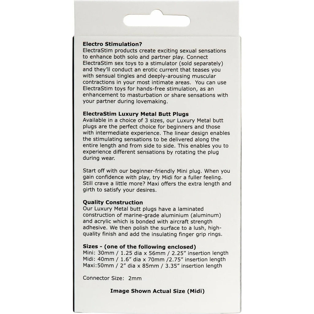 The Midi metal electro butt plug has a 2.75-inch insertable length that nuzzles against the prostate or enhances sexual sensation and a tapered shape that widens to a satisfying 5-inch girth. The larger size of this metal butt plug combined with the heavier weight makes Midi a sensual challenge to conquer.