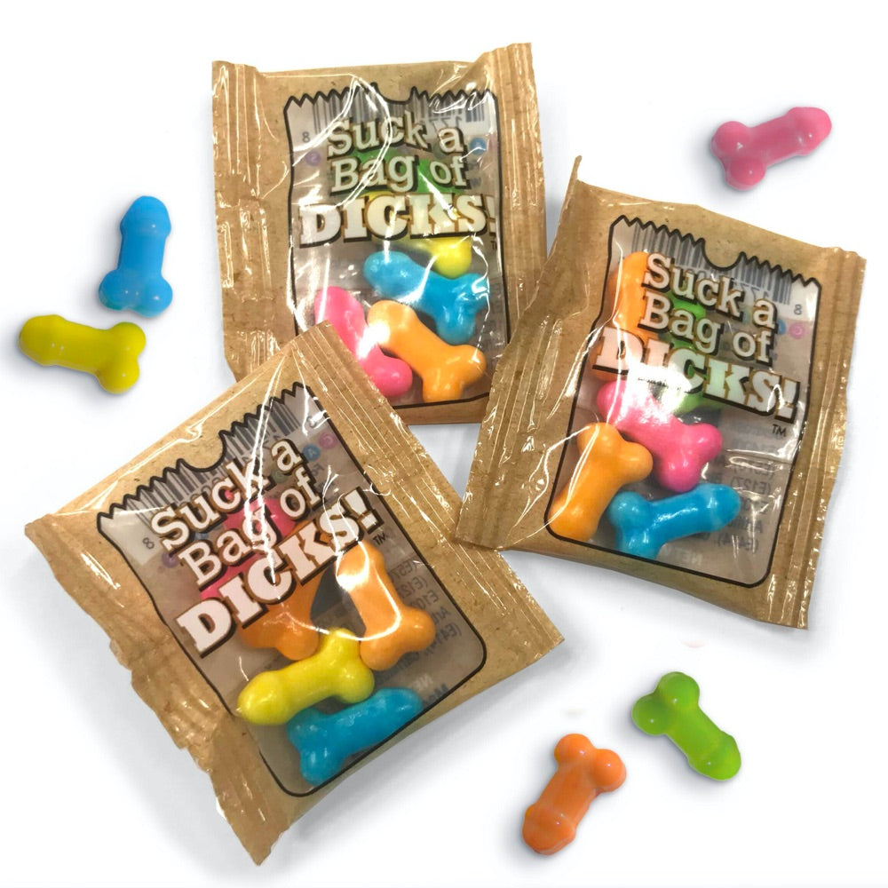 Our Suck a Bag of Dicks candies are packaged with 25 mini-packs of fruit-flavored penis-shaped candies, each containing five candies per pack. These are perfect for bachelorette party favors, pinatas, or a fun hand-out. This Dick Candy with an attitude is the perfect candy for any a**hole in your life. An excellent gift for a cheating partner, self-absorbed friend, or coworker that can’t take a hint.