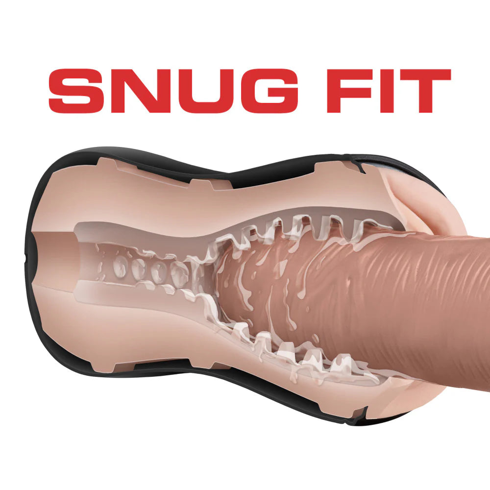 The M for Men Soft & Wet Pussy With Pleasure Ridges and Orbs stroker cup is loaded with fun! This pocket stroker is self lubricating. Add a little water or saliva and everything gets slippery. Just like the real thing! Squeeze the pliable cup and open or close the PerfectFlo™ air valve for more suction and pleasure. PerfectFlo™ mimics a blow job. You control the suction . M for Men masturbators are soft, flexible, and filled with sensational textures. Self lubricating properties are temporary. It will last up to 12 uses. To clean, wash with soap and water. Pat dry and allow to air dry before storing. You can start using water based, silicone or hybrid lubricants after self lubricating properties begin to diminish. Refresh it with our Blush Toy Renewal Powder when product is clean and dry. Considerably larger than most other similar products on the market. If you are bigger use it without the canister. It's open ended so its one size fits all.