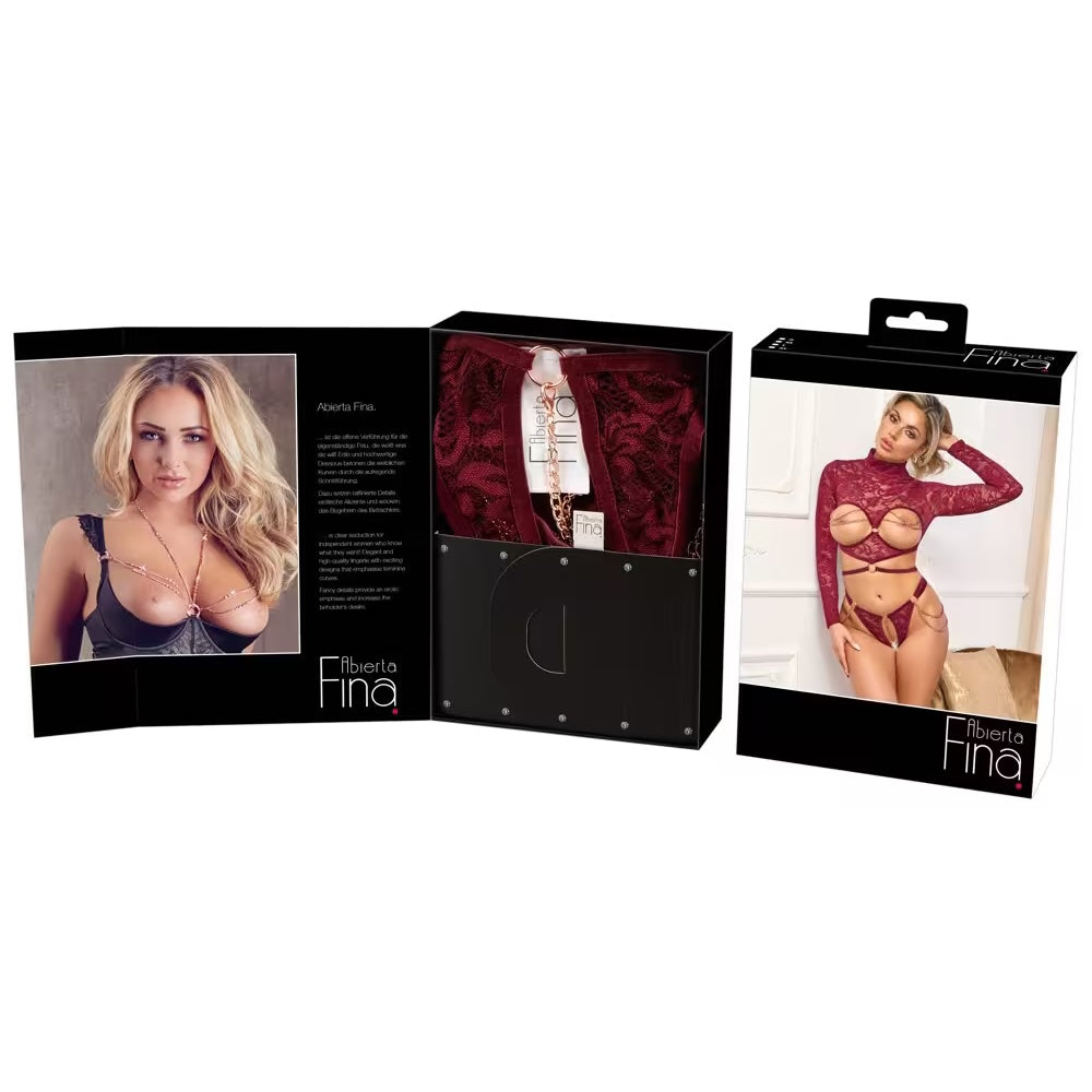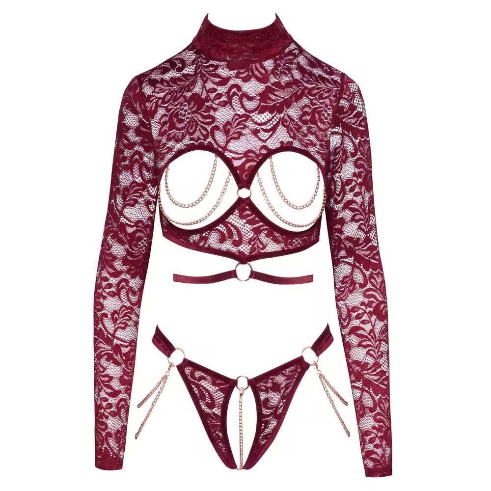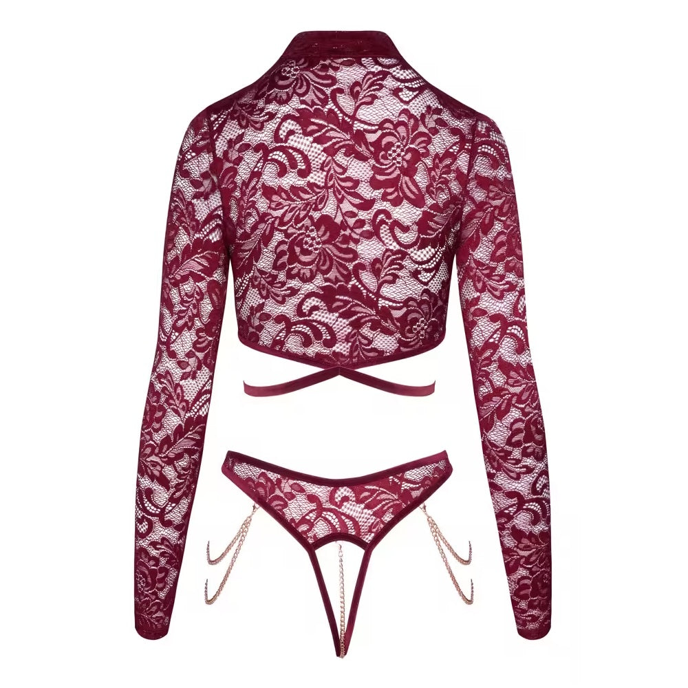 The exciting set from Abierta Fina contains an open cup top with long sleeves and a crotchless thong. The delicate dark red lace is seductively emphasised by the velvet straps and rose gold-coloured chains & rings. It is soft and stretchy for an extremely comfortable fit.