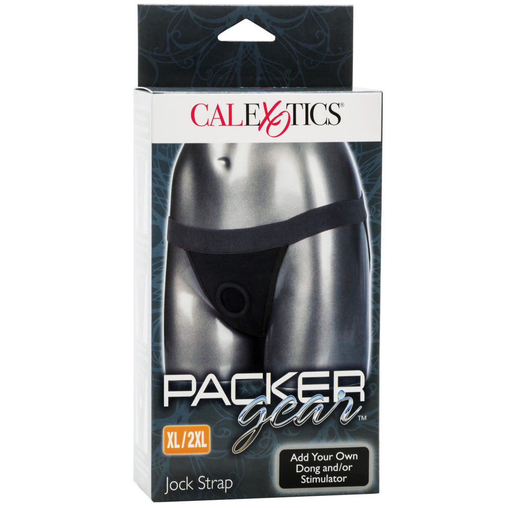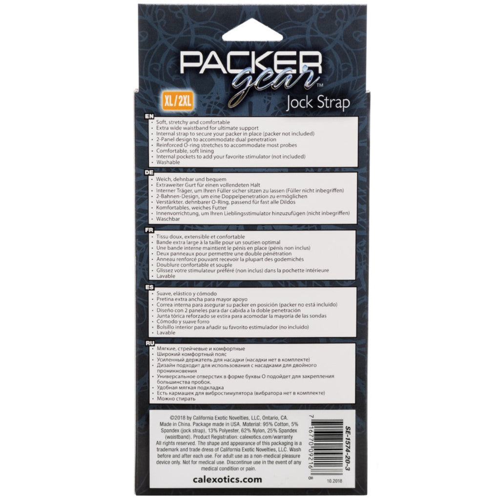 The Packer Gear ™ Jock Strap the ultra-soft strap on harness designed with powerful performance and stretch-to-fit comfort in mind. This classic harness has a supportive extra-wide waistband, soft stretchy material and internal probe straps for the ultimate support. Enjoy double penetration pleasure with the accommodating 2-panel design and unique bullet vibrator stimulation pocket. The durable, reinforced O-ring stretches to accommodate your favorite packer, vibrator or strapless dildo.