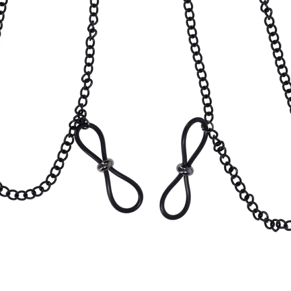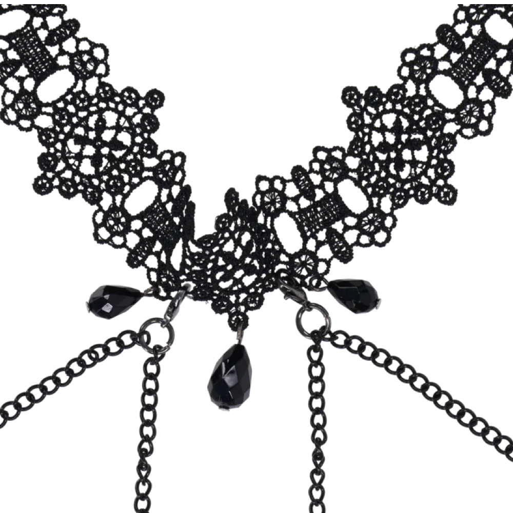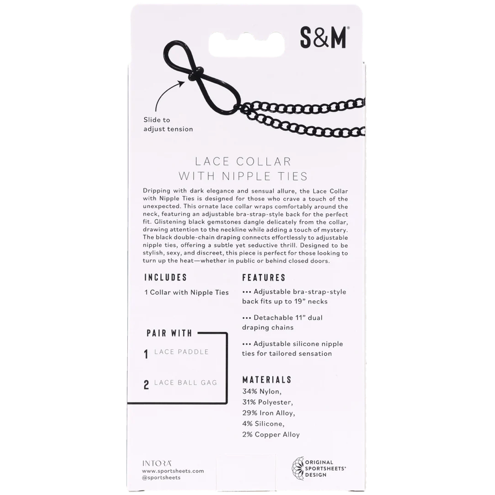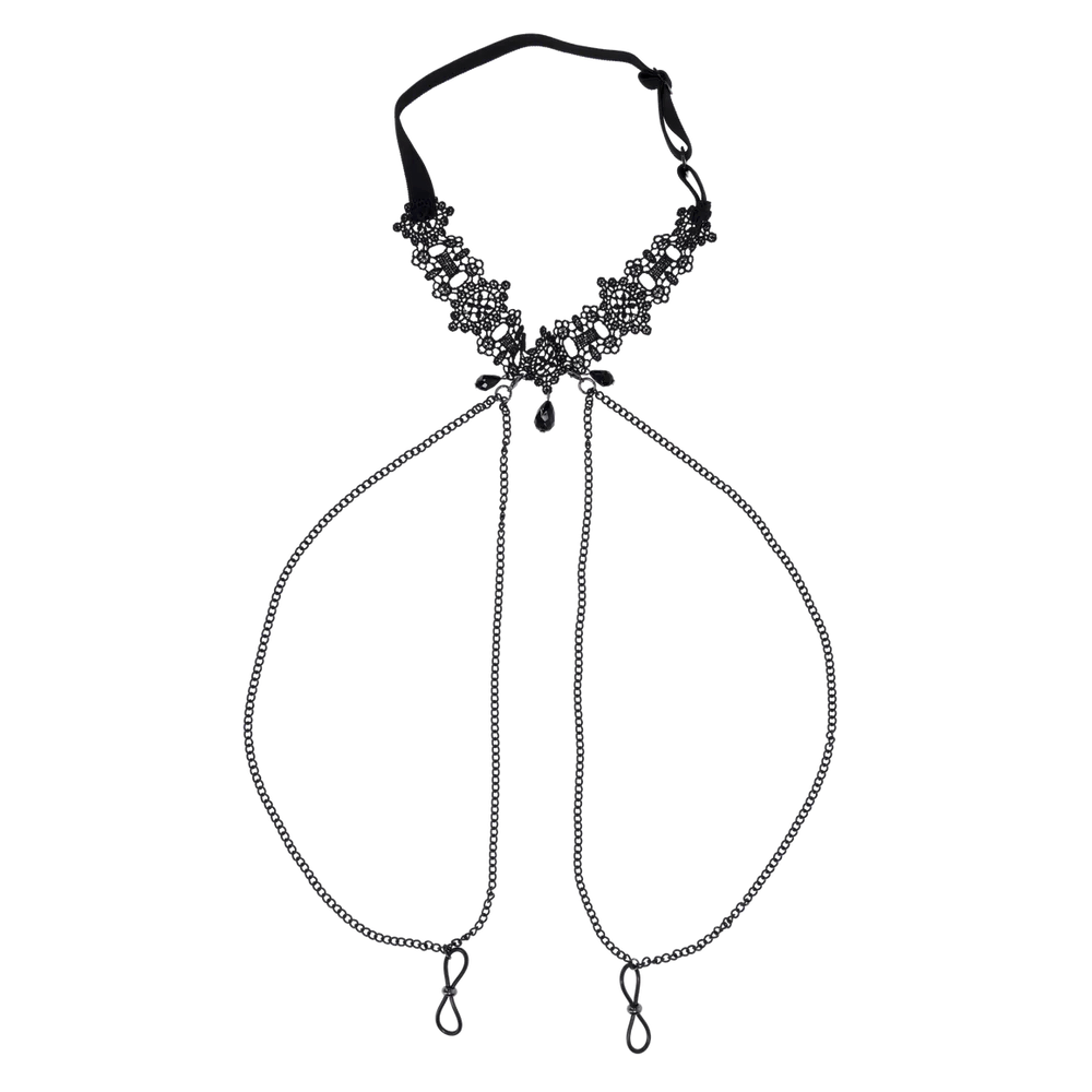 Dripping with dark elegance and sensual allure, the Lace Collar with Nipple Ties is designed for those who crave a touch of the unexpected. This ornate lace collar wraps comfortably around the neck, featuring an adjustable bra-strap-style back for the perfect fit. Glistening black gemstones dangle delicately from the collar, drawing attention to the neckline while adding a touch of mystery. The black dual draping chains connect effortlessly to adjustable nipple ties, offering a subtle yet seductive thrill. Designed to be stylish, sexy, and discreet, and perfect for those looking to turn up the heat whether in public or behind closed doors.