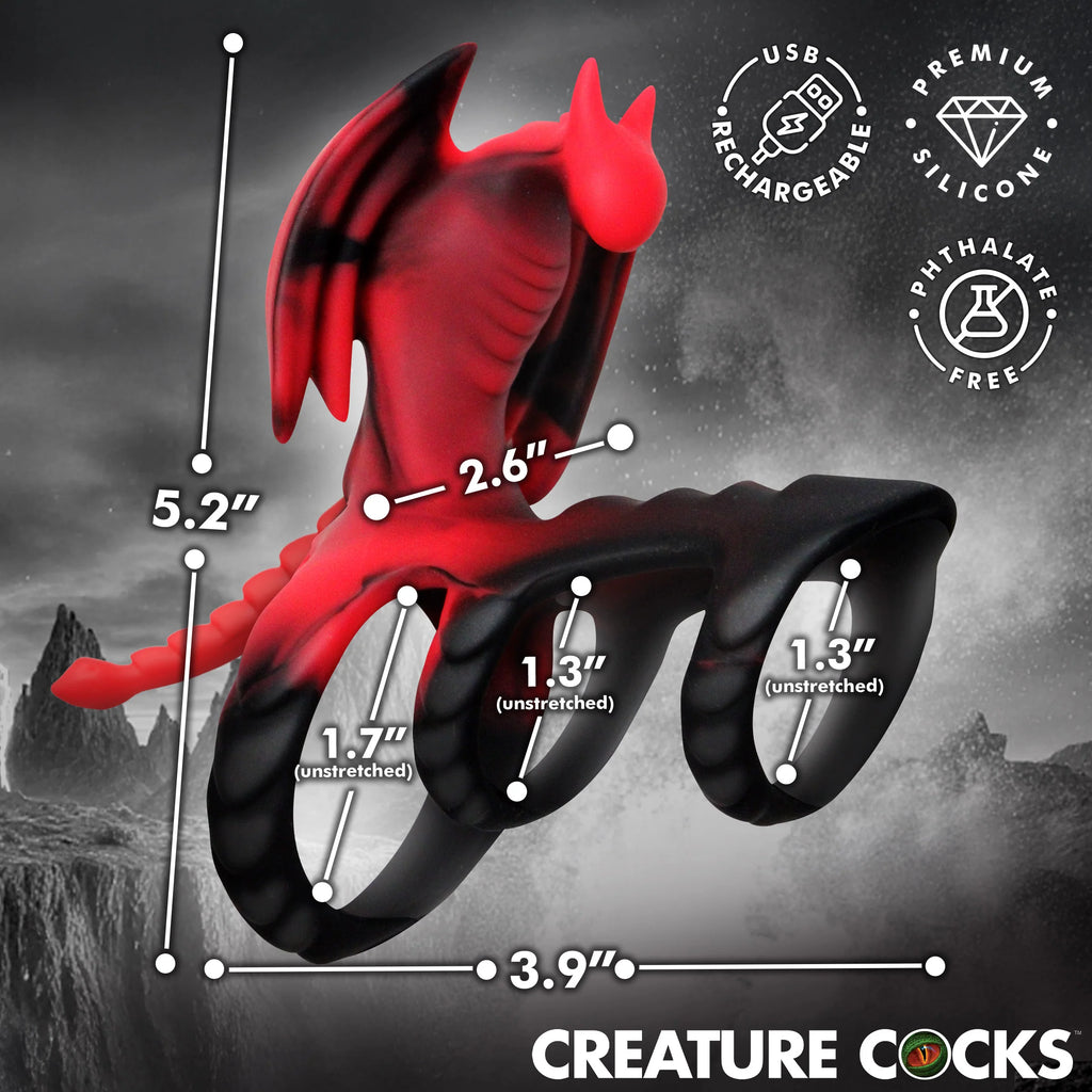 Forget How To Train Your Dragon… let this dragon train you to ride your partner with stamina and vitality! This little guy puts a fire into your pants as his many wrings wrap around your shaft and balls. Experience extended sessions, bigger releases, and a satisfied lover. Ignite your wildest fantasies with the Dragon Flight Vibrating Silicone Cock Ring, a steamy pleasure toy sculpted as a fierce dragon. Rows of ridged scales tease with every movement, offering your partner an irresistible thrill. The vibrating dragon perches boldly at the base, boasting 3 speeds and 7 pulsating patterns that make every session unforgettable. Crafted with artistic detail, this dragon features wings, a ribbed chest, a curved head, and a winding tail, setting the stage for adventurous play. Designed for comfort and control, the stretchy rings embrace both your shaft and balls to enhance stamina while promising an intense climax. Indulge confidently in premium body-safe silicone for the ultimate blend of comfort and excitement.