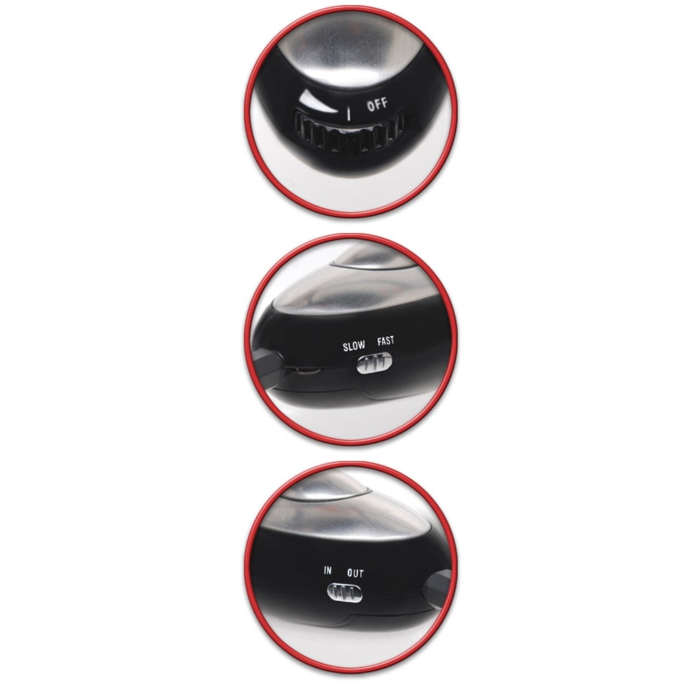 The Luv Touch compact control unit sends electrical impulses to the probe and can be used alone as a hand massager or together with the probe. To use the control as a hand massager, switch to "IN" mode. The oval center piece delivers the shock once your palm touches any other part of the metal. To use the power unit with the probe, switch it to "OUT" mode and connect the probe's plug-in jack.