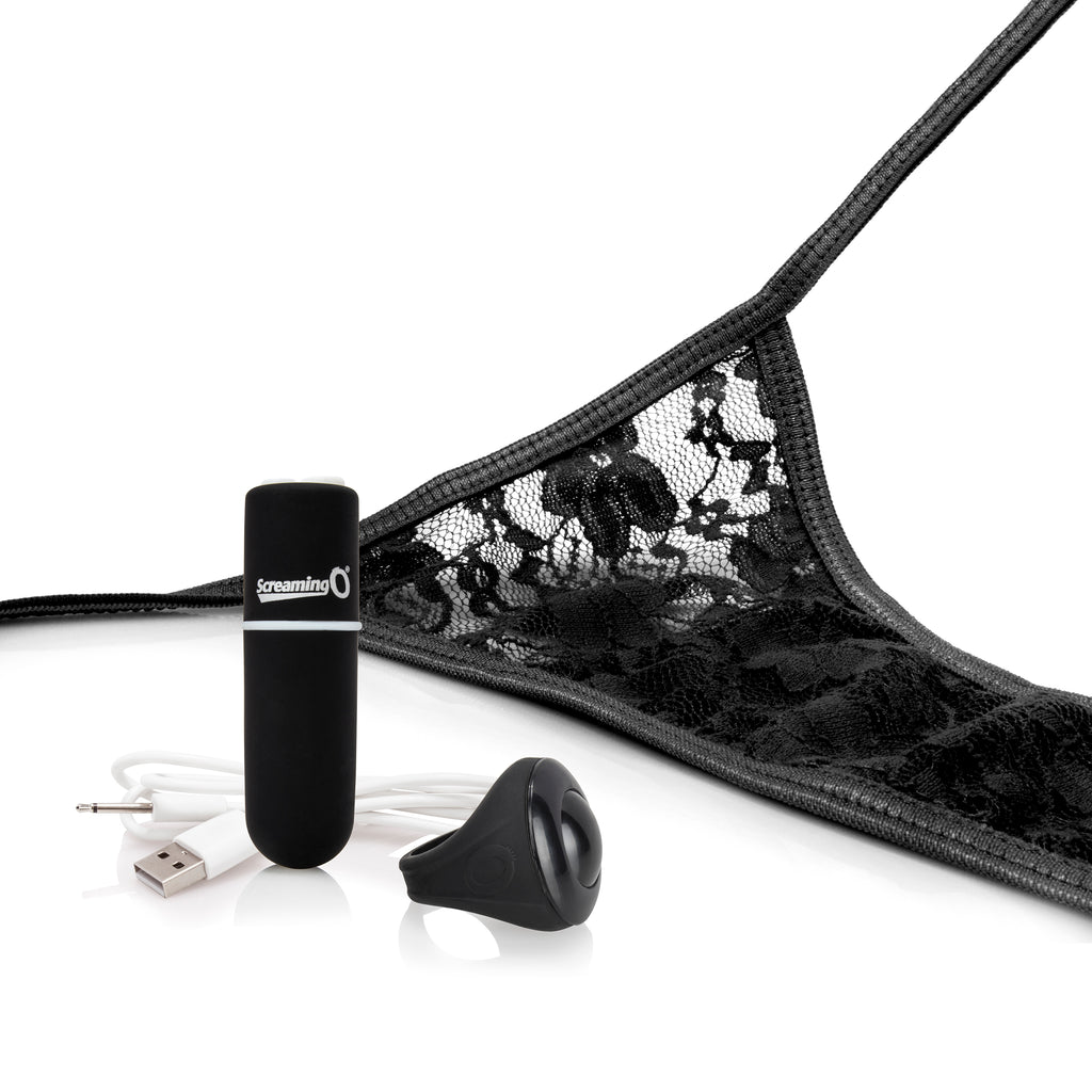 • Rechargeable remote-control vibrating panty set • Deep, rumbling Vooom® vibration • Silicone remote looks like a finger ring • Side-tie lace panty fits up to 60” waists • Made of lab-tested, body-safe ABS plastic and silicone |