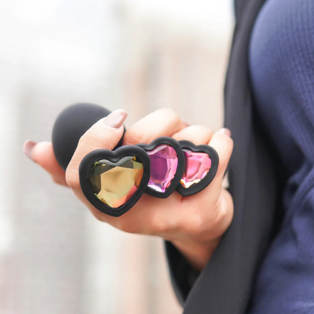 Your anal training play just got pretty with this sweet set of Bling Plugs! Starting with the small size for beginners, you can slowly graduate to the medium size and then to the large size when you are fully comfortable. This kit includes three plugs, ranging in size from small, medium, and large. Each plug features a tapered tip for easy insertion and a tight neck for gentle pressure and extended wear. Use this kit if you and your partner are new to anal play. Or just use it in addition to your regular erotic play. For the best experience, use with your favorite, high quality water-based lubricant. Ultrasilkâ„¢ smooth and made with Puriaâ„¢ silicone.