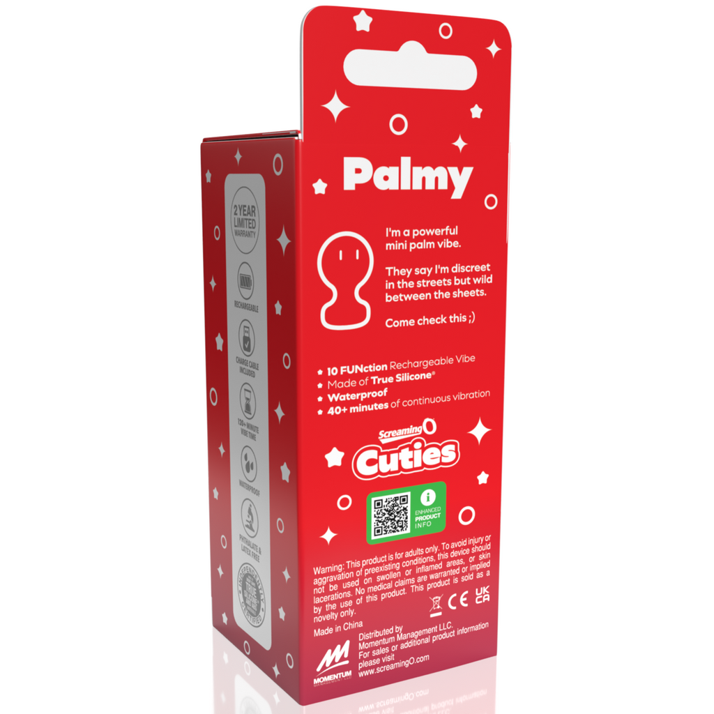 Discover Palmy, the compact palm vibe from the Screaming O Cuties line. This mini palm massager features 10 powerful functions, offering a range of vibration patterns and intensities. Made from premium True Silicone, Palmy is fully waterproof, allowing for versatile use in any environment. With up to 40+ minutes of pleasure on a single charge, it's always ready when you are. Palmy is the perfect grab-n-go item for spontaneous moments. Experience convenience, power, and elegance with Palmy, your new favorite compact vibe.