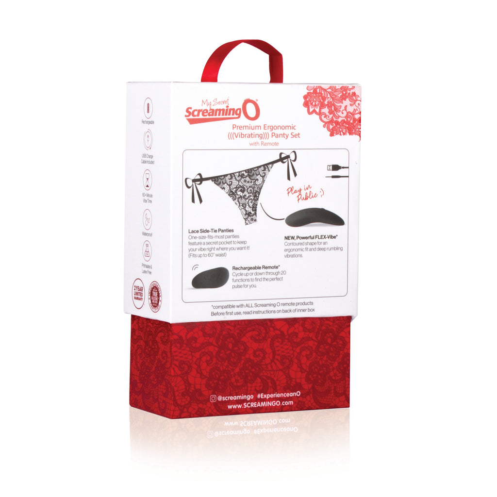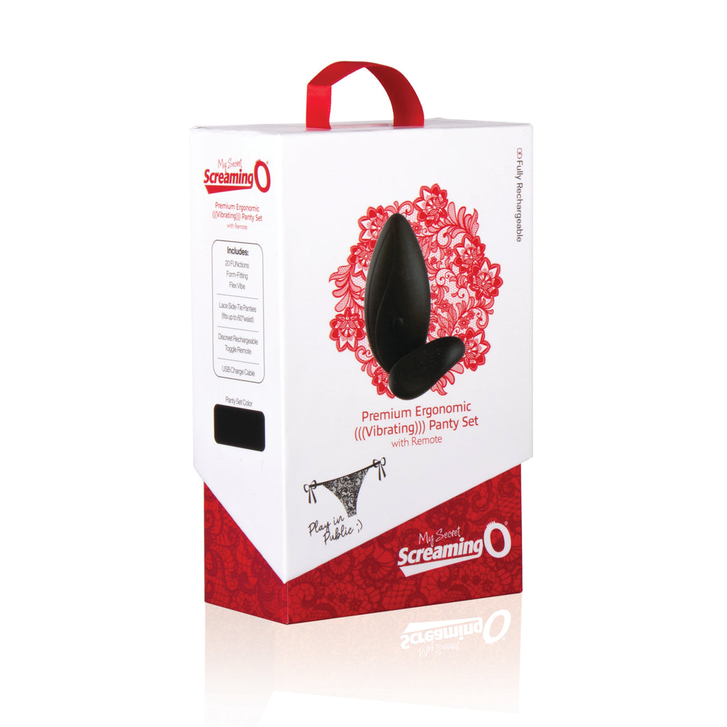 The My Secret Screaming O Premium Ergonomic Panty Vibe features a 20 FUNction contoured shaped, flexible vibe that secretly slips into a matching pair of lace panties, designed to comfortably fit up to 60-inch waists. This form-fitting flex vibe features a soft-touch feel, is 100% waterproof, phthalate and latex free, and offers over 60 minutes of deep rumbling vibration time. My Secret Premium Ergonomic Panty comes with a discreet rechargeable toggle remote, but play can be enjoyed with or without it. Whether alone, or with a partner My Secret Screaming O Premium Ergonomic Panty Set provides for a next-level pleasure experience.