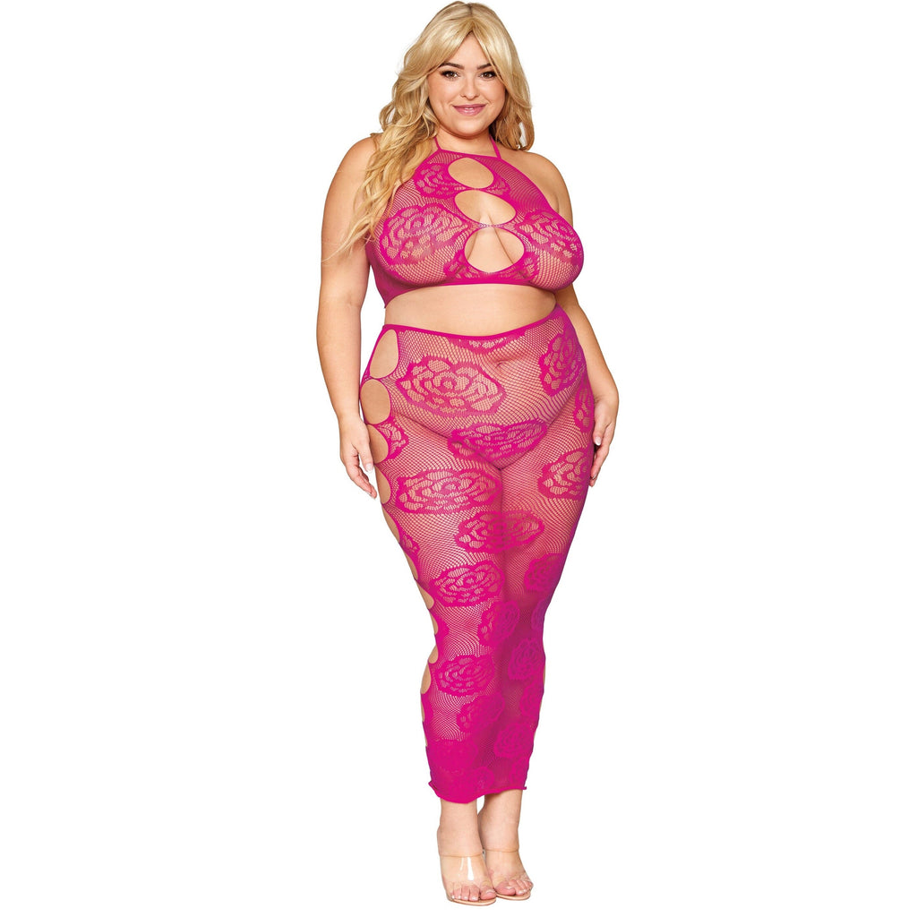 Seamless bralette and long skirt set with knitted large rose and fishnet pattern. Adjustable halter tie and keyhole details. G-String not included.