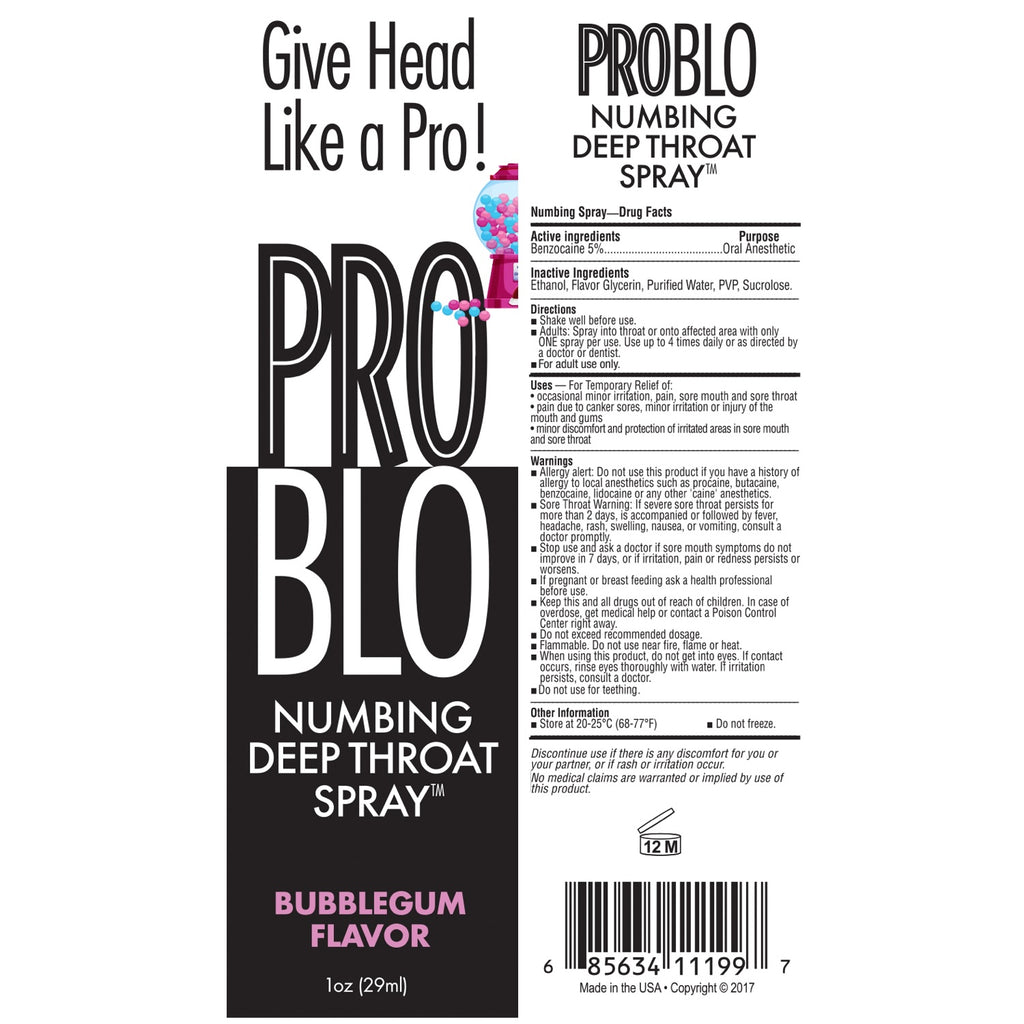 ProBlo Throat Spray comes in a 1 oz bottle. The numbing spray made in the United States contains no parabens or sugar. For use: Insert the applicator in your mouth with the tip pointing toward your throat. Spray 2-3 times, approximately 2-5 minutes before performing oral sex.