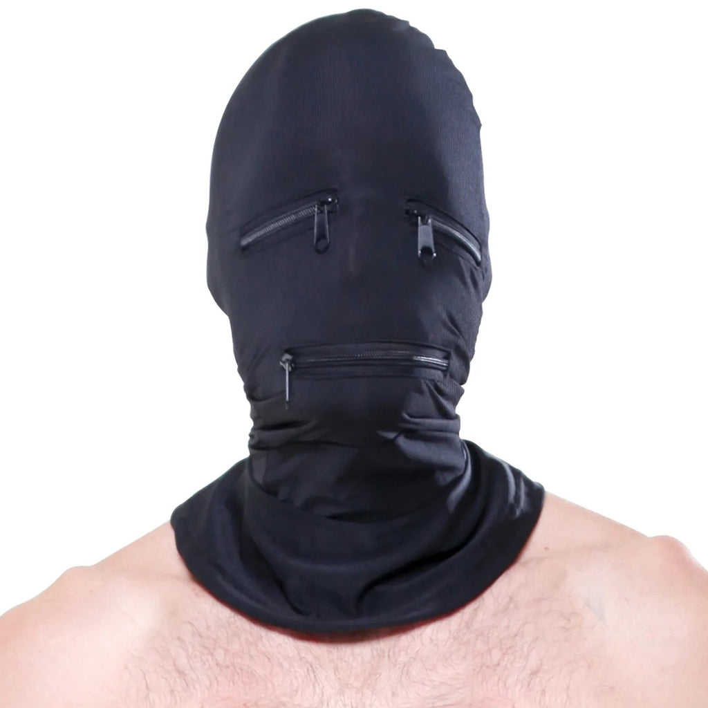 This lightweight hood is made from high-quality polyester-spandex designed to fit most sizes and allows easy breathing. The eyes-and-mouth zippers gives you control over what your subject can see or taste. Zip the eyes and mouth shut, turn out the lights, and turn on the fun!