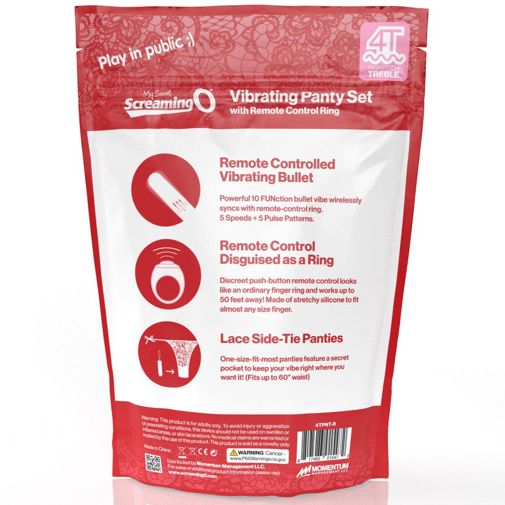 My Secret Screaming O 4T Panty Vibe puts the power of pleasure at your fingertips with a powerful, 4T treble style tickle and tease vibrating bullet that fits discreetly into a side-tie lace panty to keep it in place.