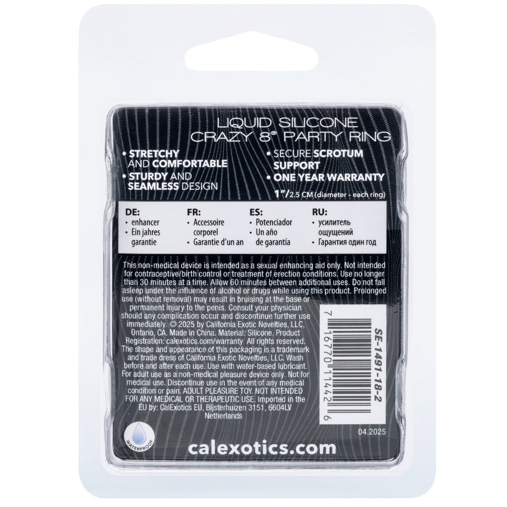 Take your performance to the next level with the Alpha Liquid Silicone Crazy 8 Party Ring. This premium Liquid Silicone enhancer is designed to deliver maximum pleasure and increased stamina, offering both a snug fit and targeted support for an enhanced experience.