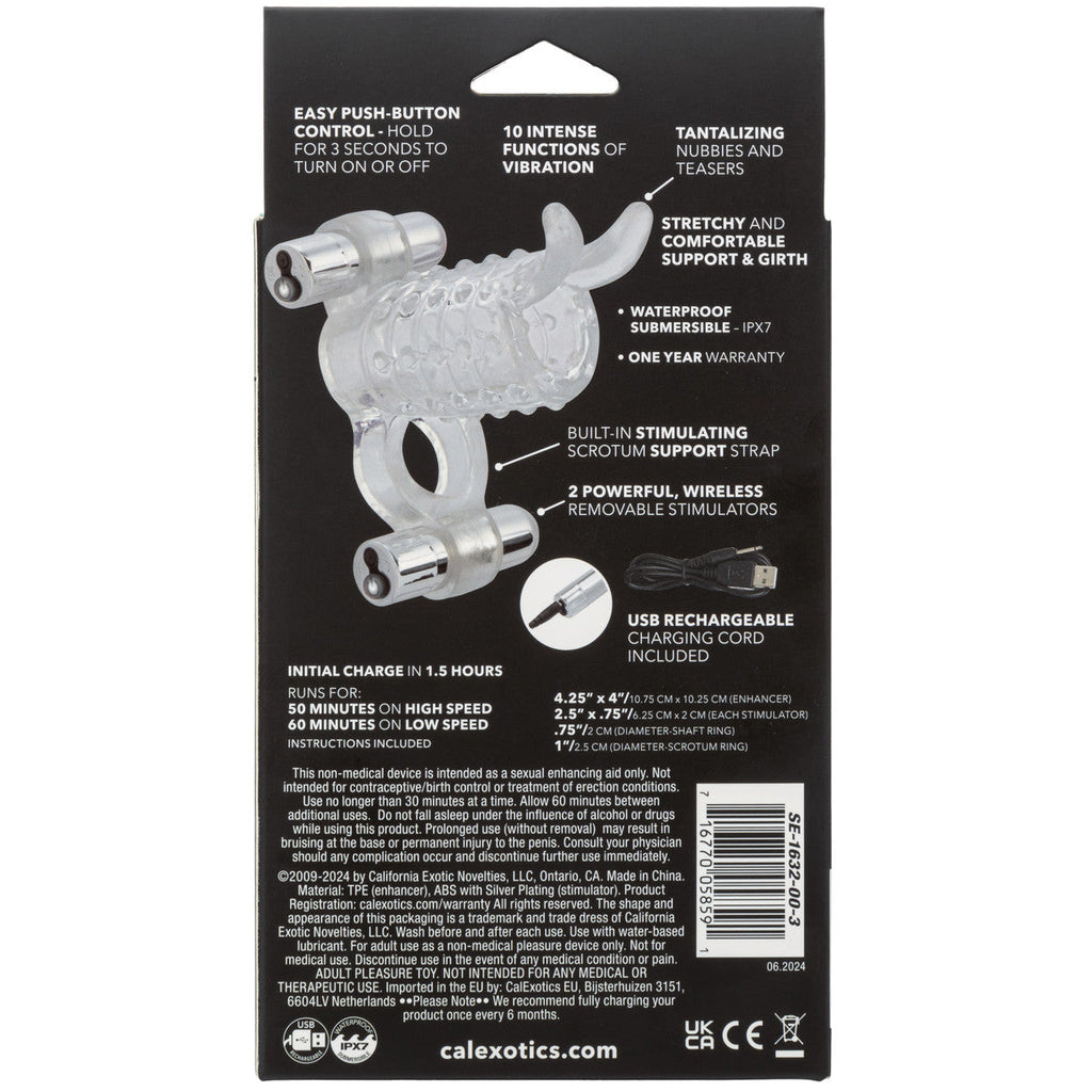 Feel the thrill of each caress intensified by tantalizing nubbies and dual teasers that add stimulation for both partners. With 10 intense functions of vibration, pulsation, and escalation at your fingertips and two removable wireless stimulators, every encounter with the Endless Desires Couple's Enhancer becomes a journey of discovery and fulfillment.