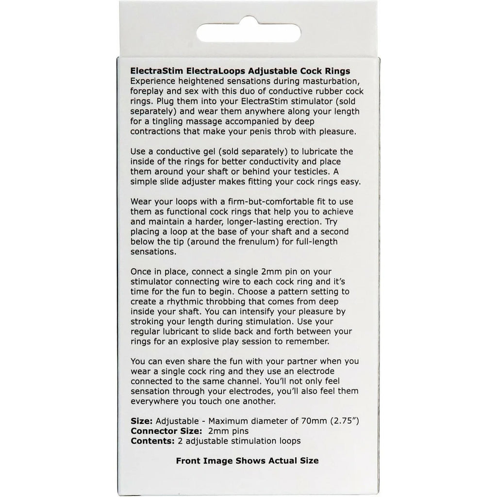 ElectraLoops aren’t just for masturbation. You can wear them around your cock and balls or at the base of your shaft during foreplay, oral sex and sex to heighten sexual stimulation. Each cock ring is adjustable up to 2.75 inches in diameter, so you can try wearing them in a variety of ways to enhance your solo and shared pleasure. Use them alongside our electro conductive gel for the best experience.