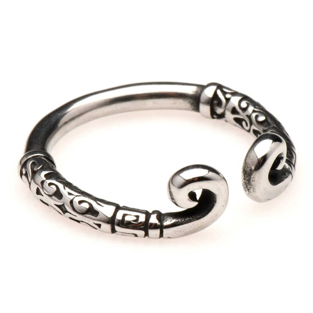 Indulge in heightened sensations and an upgrade to your look with this Kingpin glans ring! The gorgeous design includes whorls of patterns along the ring and curled ends. You're choosing quality when you choose stainless steel that is nickel-free, temperature sensitive, and strong enough to last. The pressure on the head of your shaft will make your head hard and sensitive, enhancing all feeling while you experience pleasure with or without a partner. Your partner will also enjoy the sensation of the ring on the head of your shaft, as well as the improved look! The ring even has an open closure so you can slightly adjust the tightness! To clean, simply wash with mild soap and water. Do not use it during anal play or you risk losing the ring.