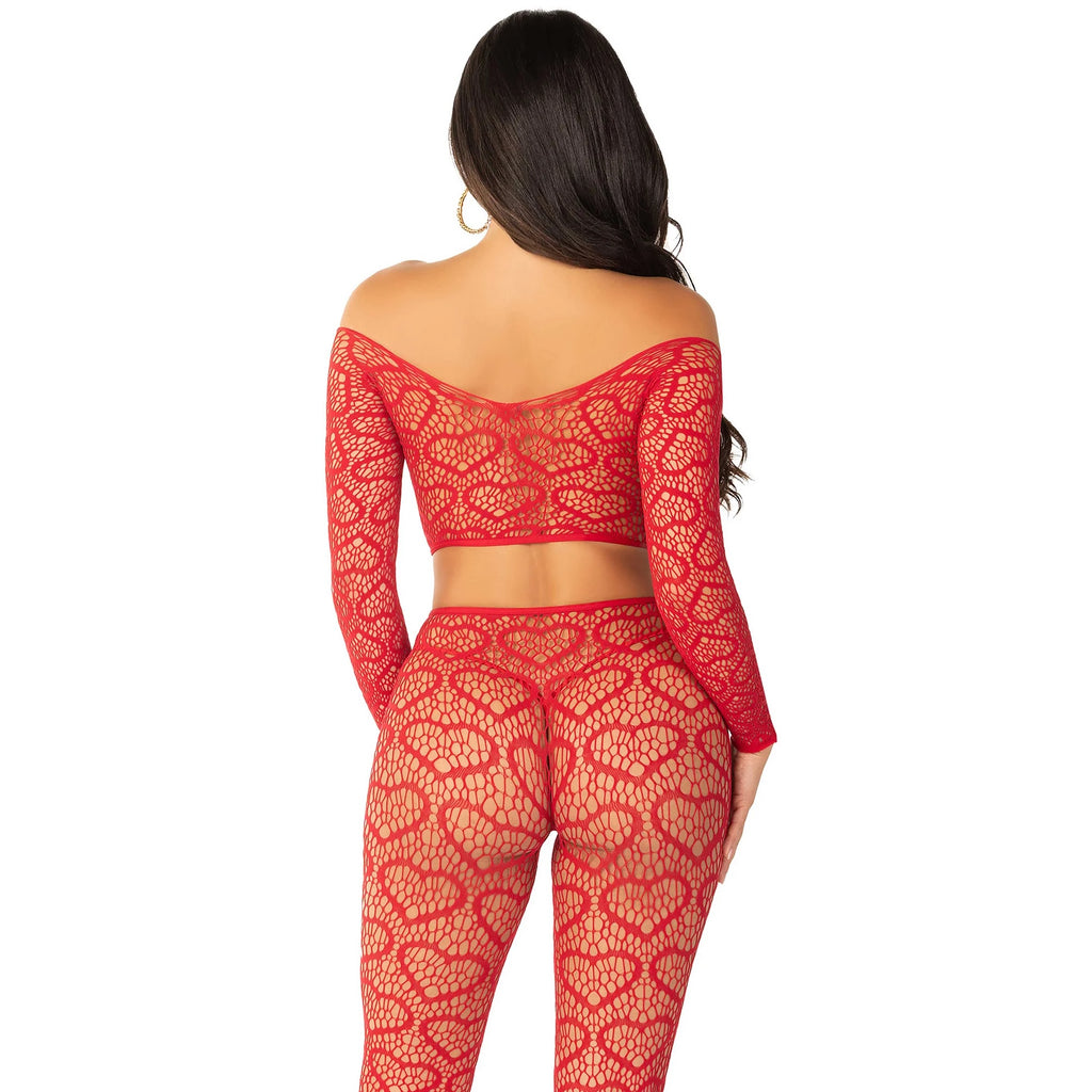 Steal hearts in this flirty 2-piece crop top set by Leg Avenue. This alluring lingerie ensemble features a heart net off-the-shoulder crop top paired with matching footless tights, creating a spicy look that’s perfect for turning heads in and out of the bedroom.