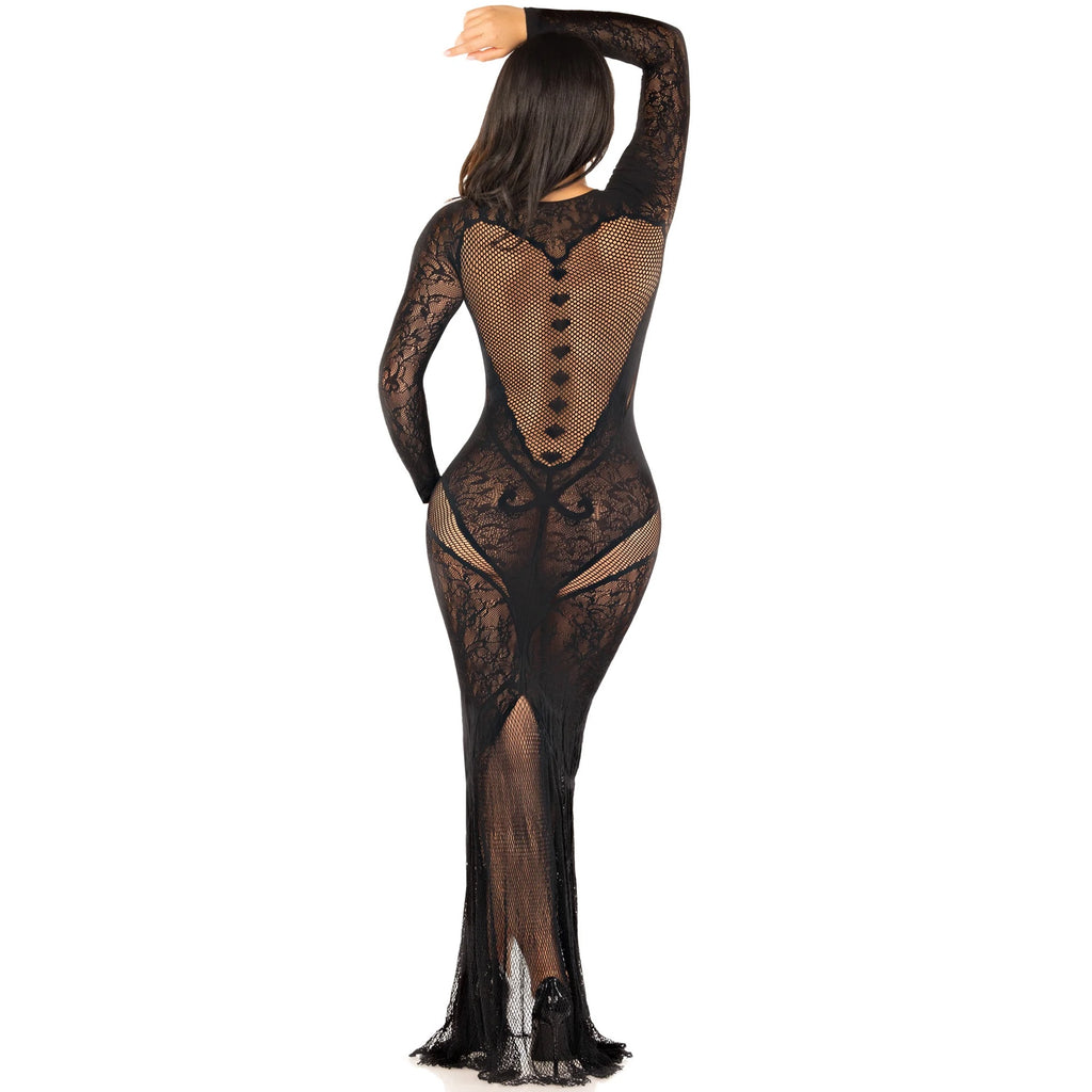 Let your curves do the talking in this jaw-dropping lace lingerie dress by Leg Avenue. With a stunning body-con silhouette, this lace and net gown features a front and back heart detail that is sure to get pulses racing.