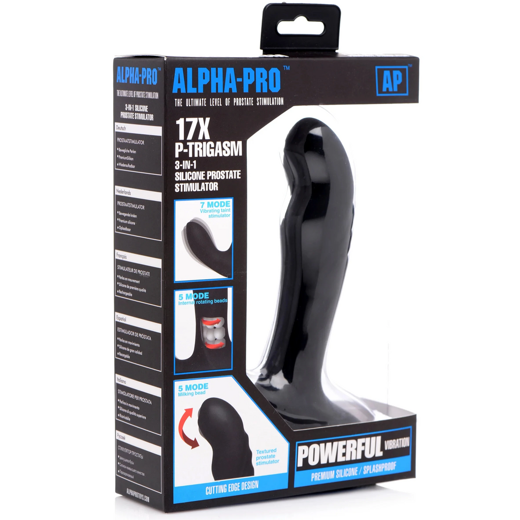 Treat your tush to a trifecta of tantalizing temptation. The 17x P-Trigasm features a powerfully buzzing perineum stem with 3 speeds and 4 patterns of external vibration. It also contains several rows of rotating beads beneath the surface of the shaft base, to swirl seductively around your sphincter with 5 settings. Finally, a bead beneath the surface of the tip will move up and down, milking your sweet spot with an additional 5 modes of motion. Â Made of silky-smooth silicone, you can enjoy a seamless insertion. This premium, rechargeable pleasure tool is waterproof, non-porous, and phthalate-free. Avoid use with silicone lubricants. Clean after use with mild soap or toy cleaner.