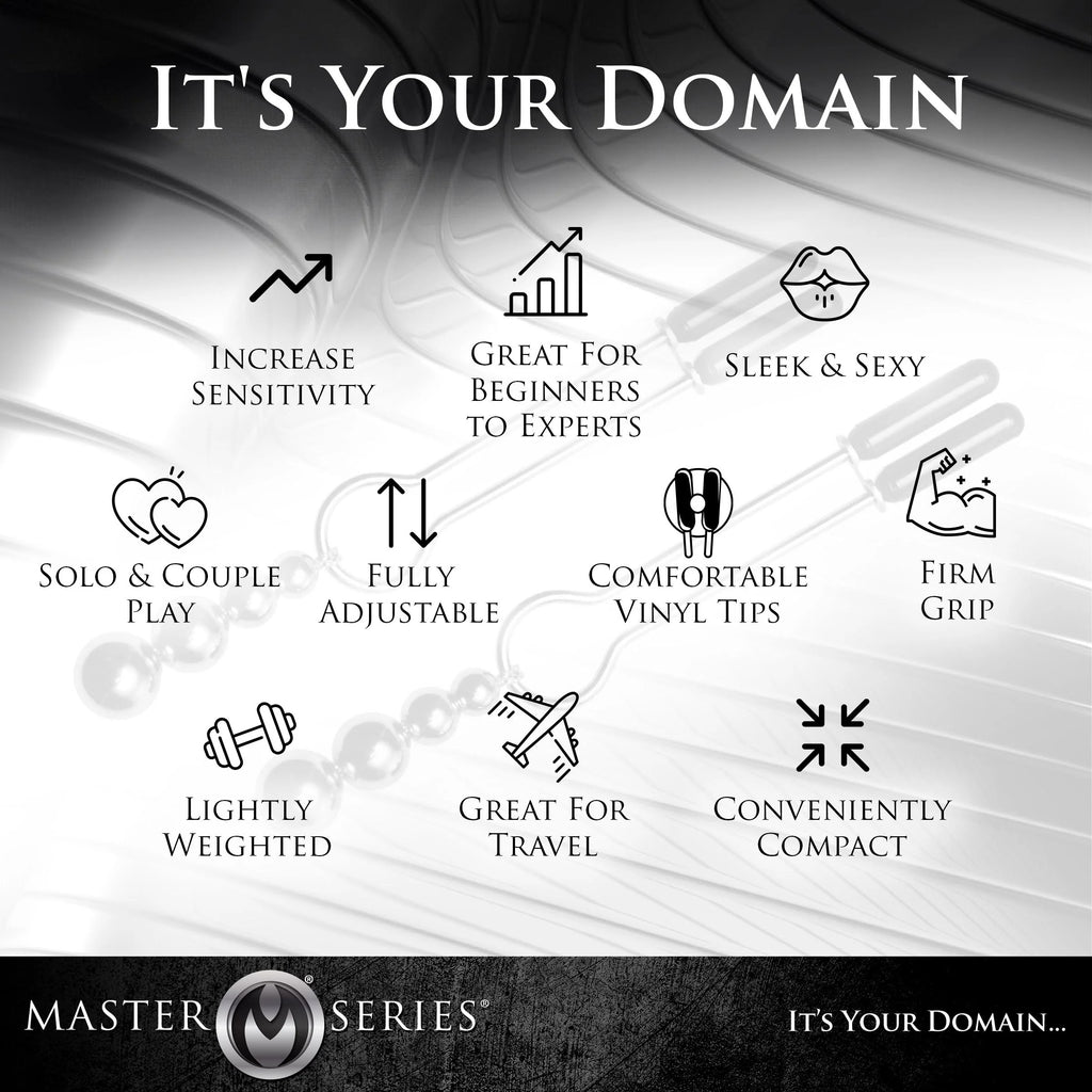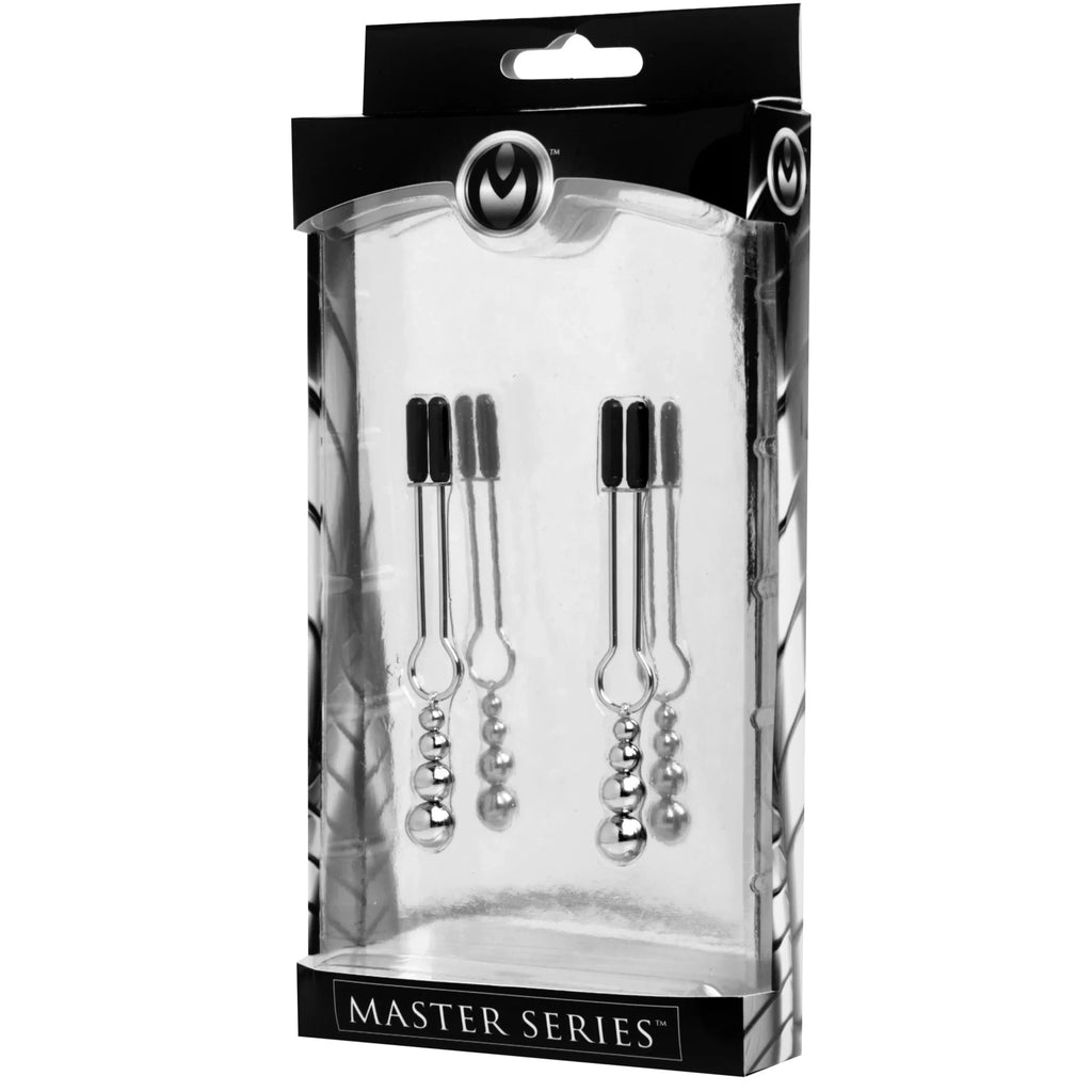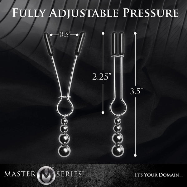 These tweezer style nipple clamps adorn the chest with three graduated silver balls that dangle from the end. The adjustable clamps have a sliding ring that will allow you to modify the amount of pressure that is applied, and are coated with vinyl for comfort and a better grip. These beaded clamps are ideal for beginner or advanced nipple play. With a little imagination, they can also be used on the scrotum, penis, labia, ears, or any part of the body you desire...