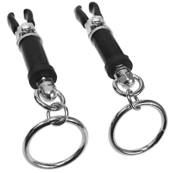 The Amulet D-Vice Adjustable Nipple Clamp Set is an effective training tool in the art of endurance and sensation play. These exquisite clamps come equipped with an adjustable barrel so the wearer can graduate to a tighter fit. The TPR coated clips are designed to accommodate the natural curvature of the nipple. Use your imagination, this devious set includes a convenient O ring that can be weighted, laced, etc. It is your domain...you decide!
