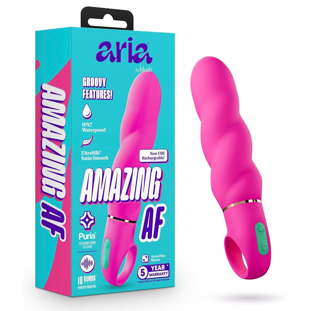 Beautiful and powerful, meet the Aria® Amazing AF. Featuring Blush’s signature RumboTech™ technology, this gorgeous vibrator offers 10 deep, rumbly vibration modes (5 Speeds & 5 Patterns), for a satisfying, full-body experience. The spiral-textured shaft adds visual appeal and smooth sensation, while the rounded head promotes deep, comfortable G-spot pleasure. The easy-grip loop handle provides comfort and control during every session, whether you're playing solo or with a partner. Crafted from Puria® platinum-cured silicone wrapped in UltraSilk®, Amazing AF is smooth, 100% body-safe, and feels amazing against the skin. It’s IPX7 waterproof for bath or shower play, and with magnetic USB charging, it’s always ready to deliver an experience that’s Amazing AF. Embrace the power of Aria!