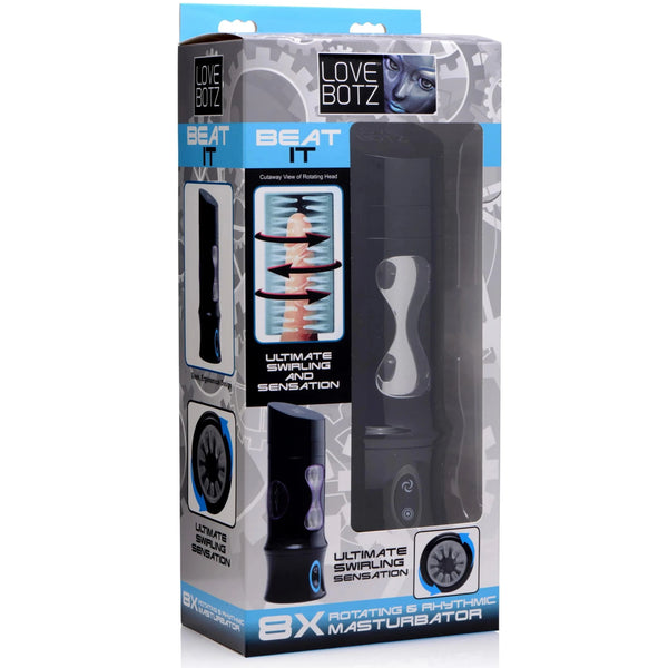 Beat off in the ultimate swirling sensations of a revolutionary rechargeable stroker! Indulge in 8 different rhythmic speeds of vibration and rotation! Your cock has never felt anything like the soft, textured interior of this male masturbation device. Turn off the lights and feel the intense, revolving shaft massage while the lights change color on this unique mens toy! The removable cap makes this orgasmic stroker easy to store and perfect for travel. Just charge it up via the USB charger and shove your cock in for a one-of-a-kind experience of spiraling pleasure!