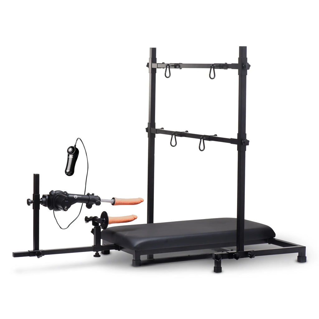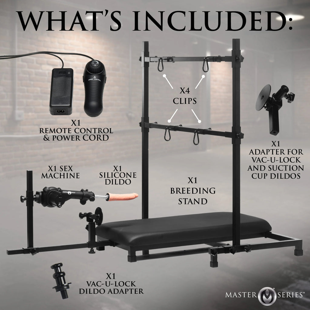 Step into versatility and function with a high-quality breeding stand featuring a durable steel frame and a plush, vegan leather-covered platform. This complete set is powered by a corded multi-speed sex machine, enabling continuous, uninterrupted sessions with intense speed settings controlled by a variable speed dial. Customize the experience to your needs with adjustable arm and leg bars, perfect for all sizes. Enjoy added creativity with spaced wrist and ankle clips, offering full restraint flexibility up to 28 inches so you can have your submissive's feet and hands up in the air, or lower the bar so their hands can hold a vibrator as they get bred. The set also comes with a top-grade silicone dildo for powerful, body-safe pounding. Explore your double penetration dreams with the detachable, stationary dildo-adapter ready to fit both Vac-U-Lock and suction cup attachments, giving you total freedom to create unforgettable fantasy scenes! Want to enjoy the sex machine on its own? It detaches completely from the machine and can be used as a handheld, standalone toy!