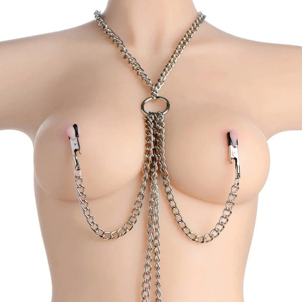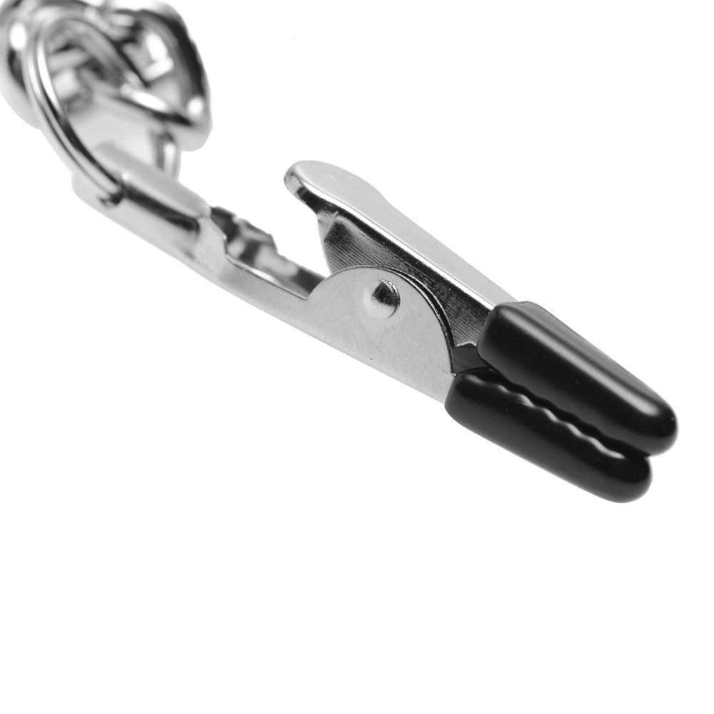 With this chained collar and clamp set, you can connect your playthings sensitive areas while adorned with a seductive chain collar. The clamps feature vinyl-coated ends and will provide constant stimulation. Use your imagination, this devious set can be used on the male anatomy as well.