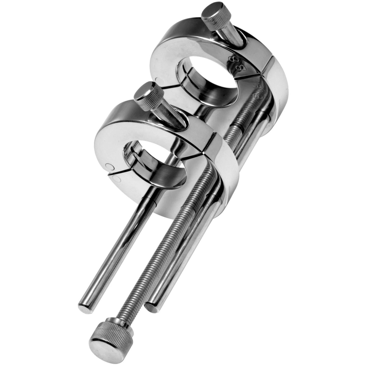 This extreme CBT device is one of the most intense ball stretchers we offer. Finely crafted out of smooth, gleaming stainless steel, it is designed to trap the scrotum and slowly stretch it out until you have reached the limits of what can be endured. Not for the faint of heart, this deviant piece is basically a rack for the balls. Secure both rings above the testicles, right at the base of the scrotum. Twist down the screws at the side of each ring to lock them in place. Then, slowly turn the large screw, which pulls the rings apart, stretching the scrotum between them. Not only do you get the sensation of the rings forcing your ball sack to stretch, but the weight of the piece itself creates a downward pull for even more pressure. Whether you slightly space the rings for gentle resistance for increased pleasure during stimulation, or test the limits of torture, this exquisite piece is sure to give you a lifetime of play.
