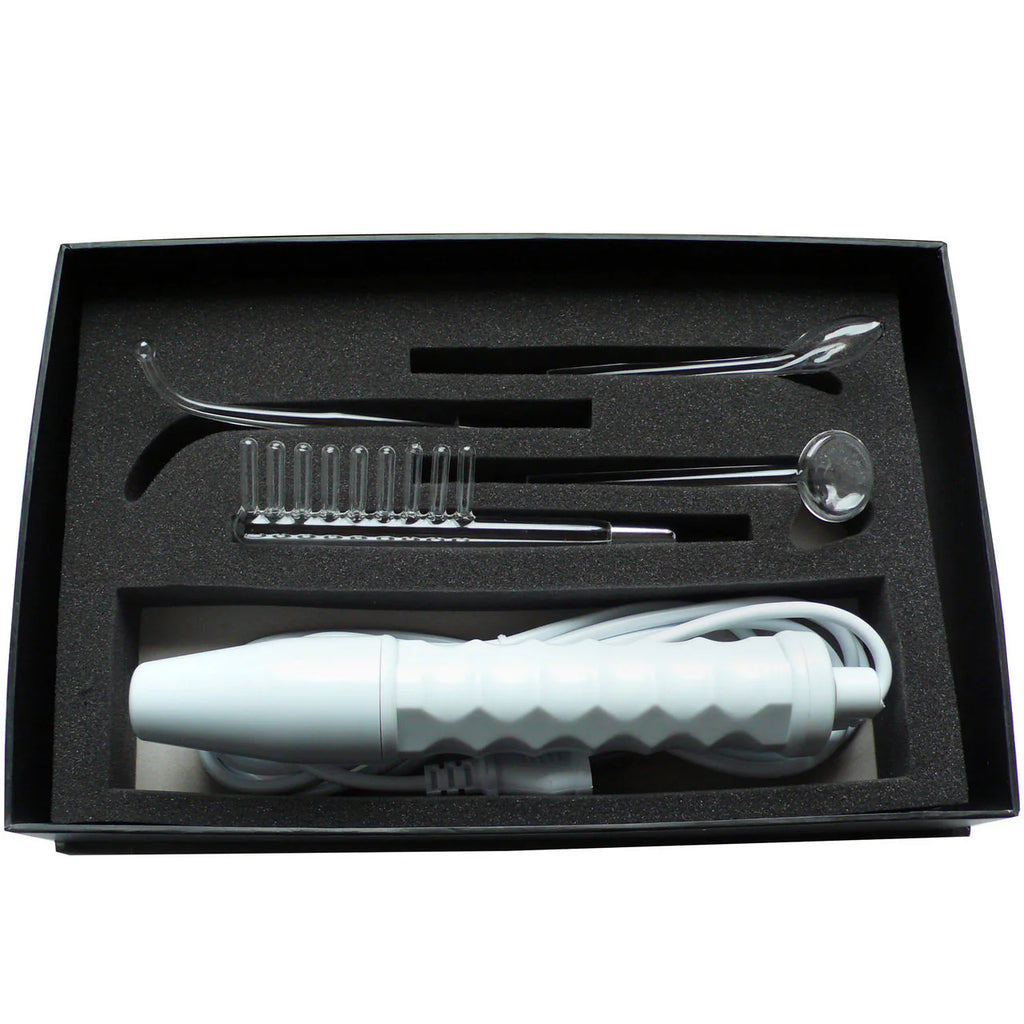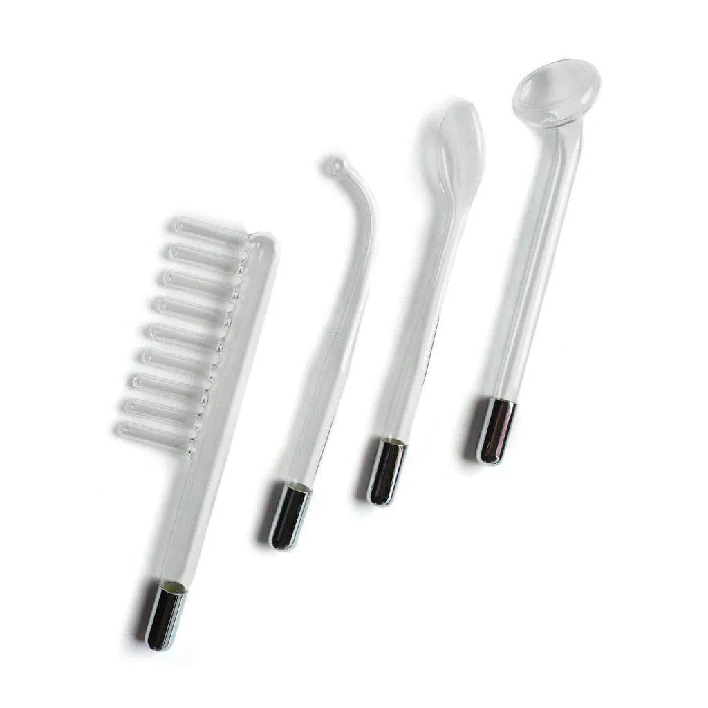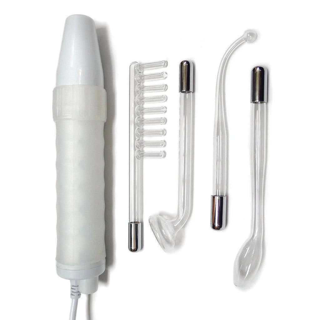 The Neon Wand kit comes with 4 different glass attachments (Electrode Comb, Mushroom Tube, 90° Probe, Tongue Tube) that will be a thrill to experiment with. The color refers to the color of the light glowing in the glass electrodes.