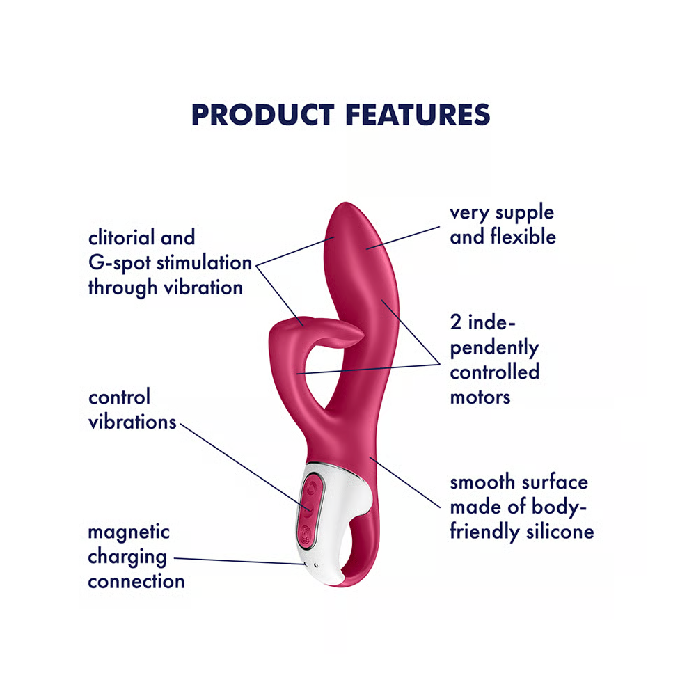 This vibrator will take you to new heights with multiple stimulations. The rabbit vibrator has two powerful motors that will make you tremble. The curved shape of the shaft and the pointed end pamper the G-spot, while the clitoral stimulator with 3 nubs provides sensual stimulation of the clitoris and labia. For a new kind of stimulation, thanks to the curved shape of the stimulator your pleasure pearl is stimulated from above .