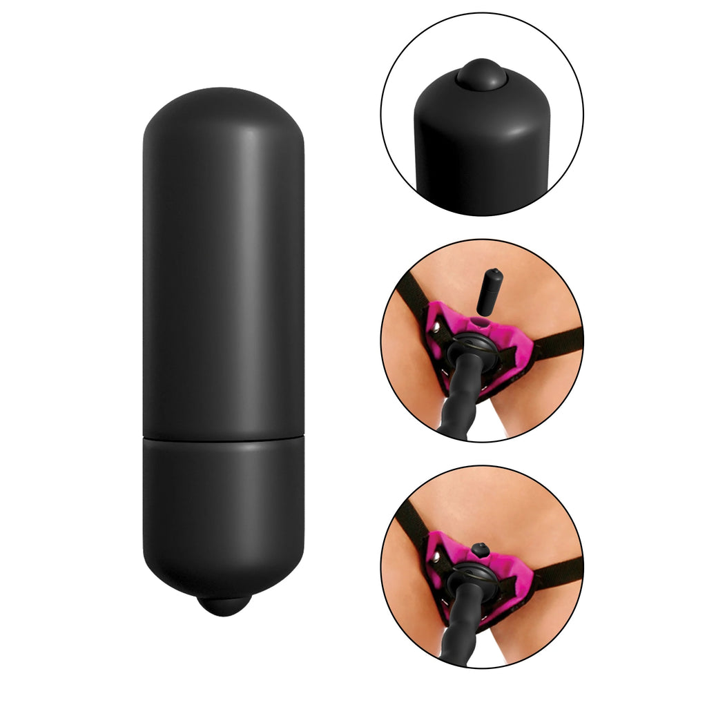• (1) Dildo • (1) Adjustable Harness • (1) Vibrating Bullet • (3) Rubber O-Ring |