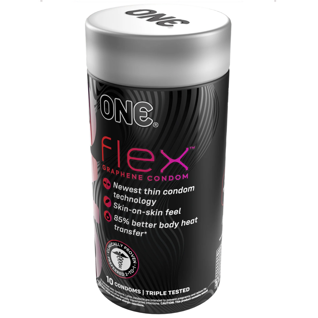 • Graphene is carbon-based, giving ONE® Flex® condoms a signature, charcoal hue, incredible elasticity, and a comfort fit for improved sensation.