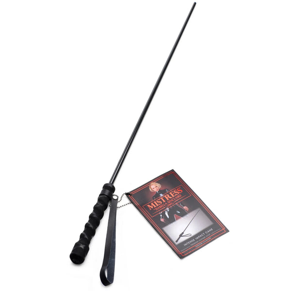 Your sub better obey... or else! This Intense Impact Cane is not for the weak. With a solid plastic rod, it will deliver your message loud and clear. Its rubber handle is molded to fit your fingers perfectly so no energy is wasted during use. Each cane measures 24.5 inches in length and includes a premium loop for secure handling and easy storage. Leave a delicate criss-cross on your playthings body with this beautiful instrument of impact.