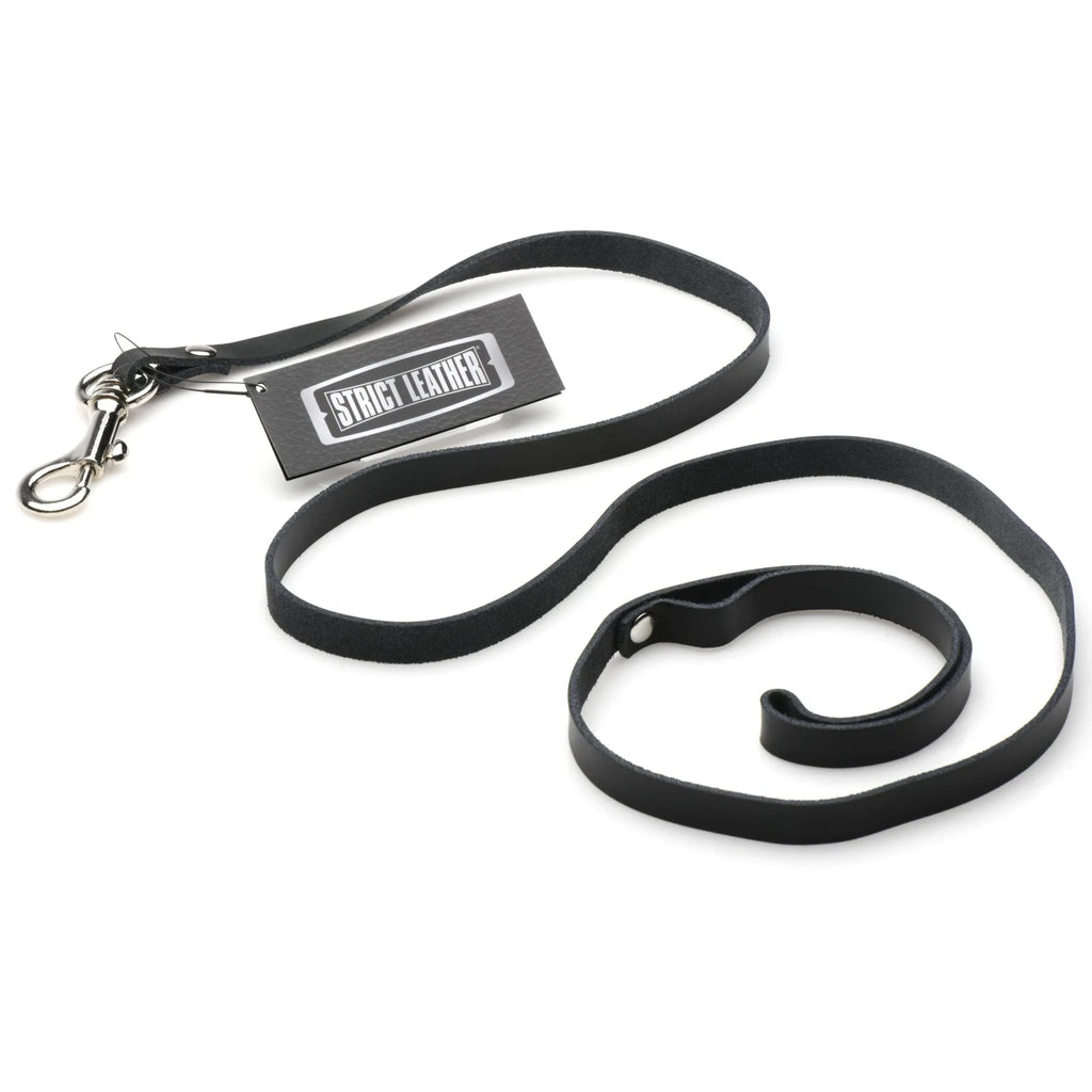 Tighten the hold on your partner with this 4 foot leash from Strict Leather. Measures 4 feet in length and is 1/2 inch wide and is made from high quality latigo leather. The leash has a loop on one end for easy handling and storage. On the other end is a snap hook to attach to a D-ring on a collar or other objects.